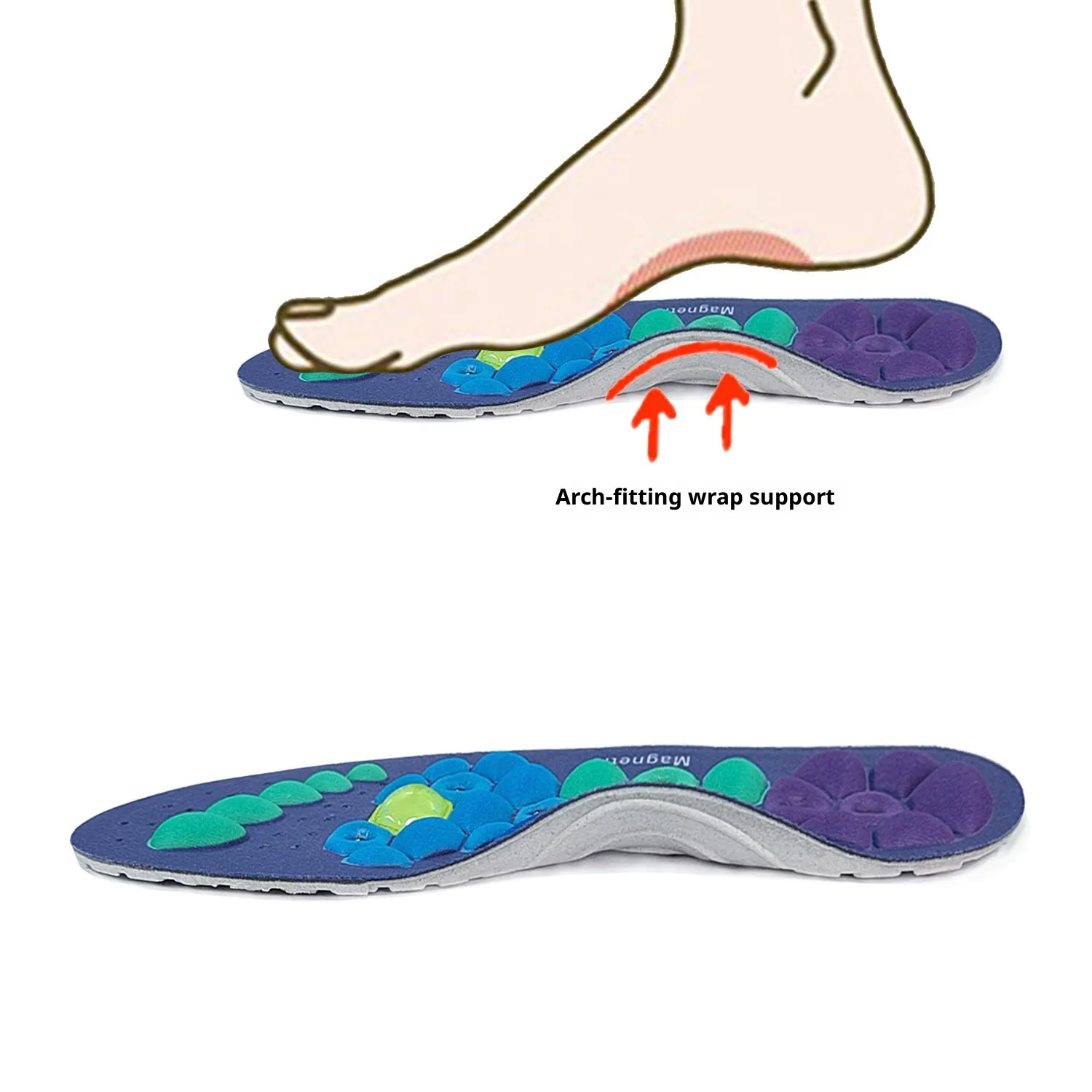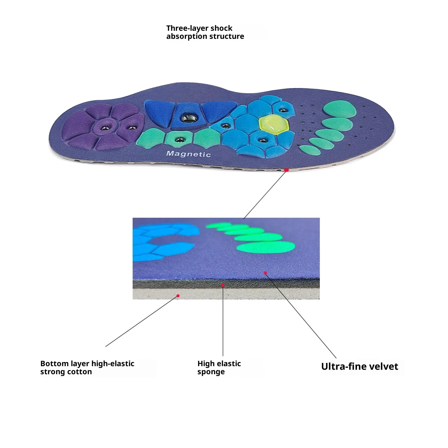 Strategically placed magnets are incorporated into the insole design as part of a magnetic therapy-inspired approach to foot comfort.