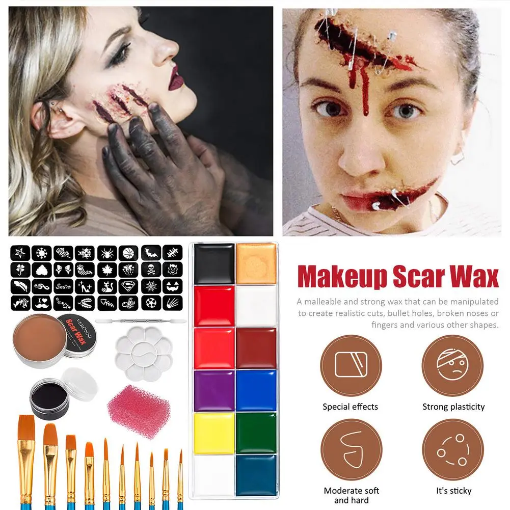 4. The package includes: 32 pattern designs. 60 grams makeup scar wax, spatula tool, plasma 30ml, 10 tool brush, sponge, body paint (12