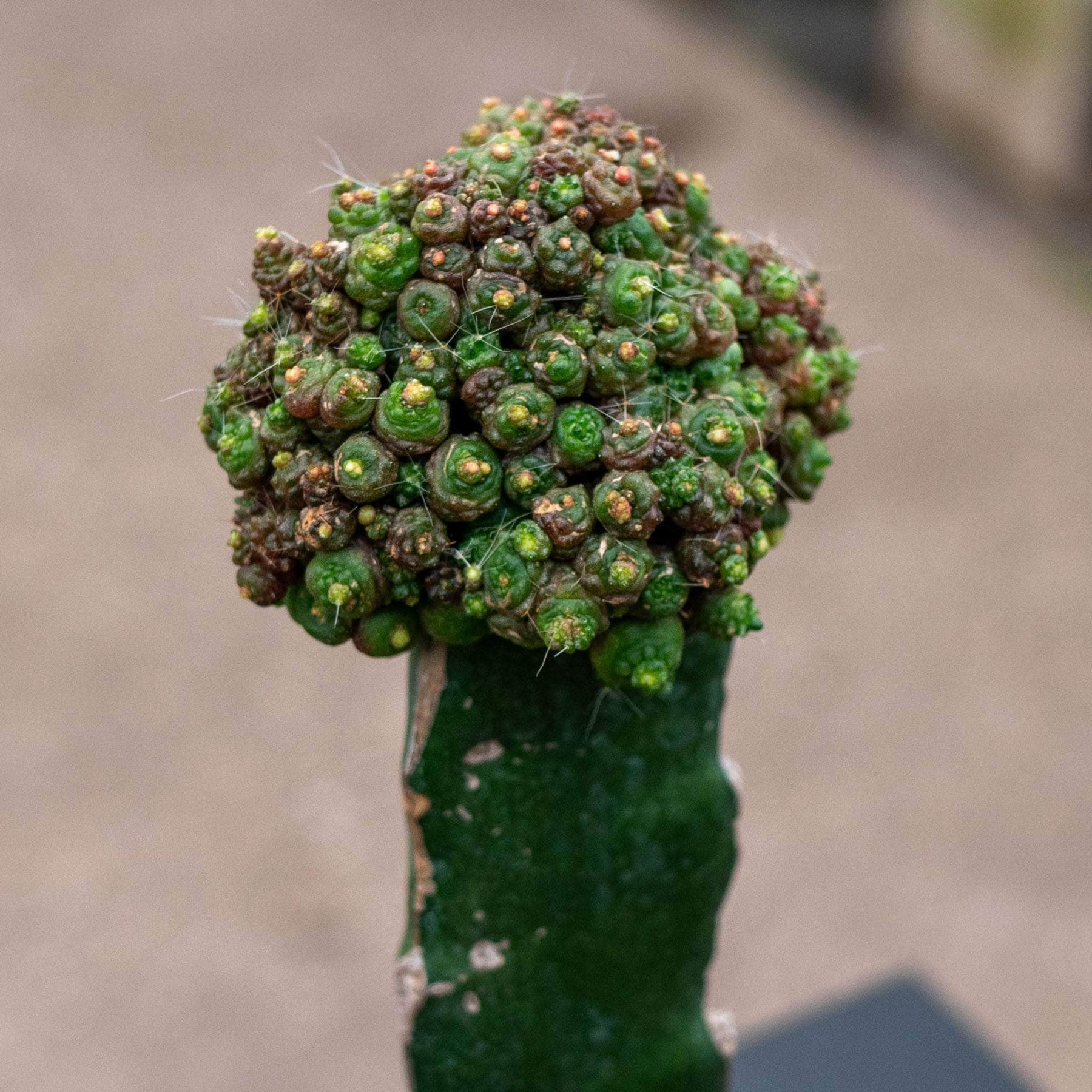 Mammillaria bocasana 'Fred' is known for its unusual and eye-catching morphology. This plant features a cylindrical base cactus that supports a dense cluster of small, globular offsets. These offsets form a fascinating, coral-like head that is tightly packed with numerous small, green tubercles. Each tubercle is adorned with short, white spines and, at times, tiny reddish-brown tips, adding to the plant's unique aesthetic.