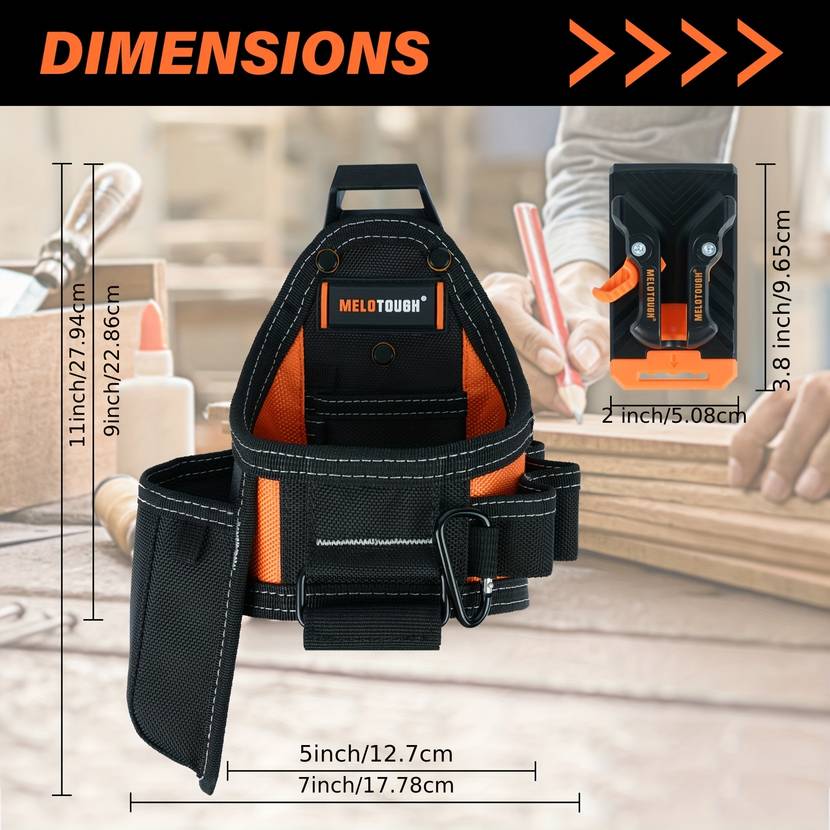 Made of constructed of heavy-duty 600D fabric for long-lasting resistance to wear and tear,and kickstand design allows the pouch to stand upright on the ground.Dimension:10”L * 5”W * 11”H Including Quick Detach Belt Clip,easy to clip off & on from any 3inch belt,you can snap it off and put it next to you during break instead of having to undo a whole belt. No more taking the entire tool off. It's very convenient and handy.Its 7 pockets and loops, including a plastic-lined knife pocket and notebook pocket, make it ideal for smaller jobs. Works great alone or enhances any tool belt.This pouch also includes a notebook,carpenter pencil and a carabiner attachment loop. Our tool pouch is designed to fit most tape measures,knifes and screwdrivers,transforms how professionals carry their tape measure and utility knife. Our tool organizer makes transporting your tools, equipment, and gear around the job simple.Tape Measure pouch--Perfect for the technician electricians, maintenance workers, HVAC, plumbers, carpenters, construct
