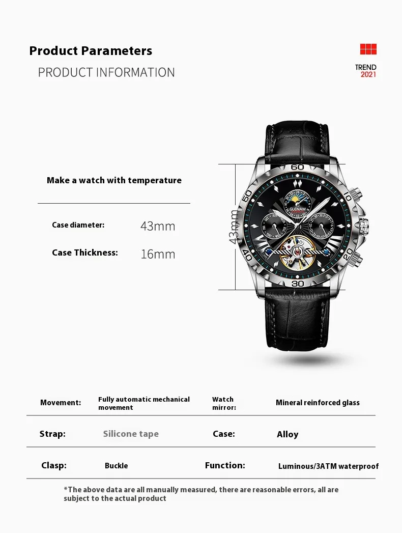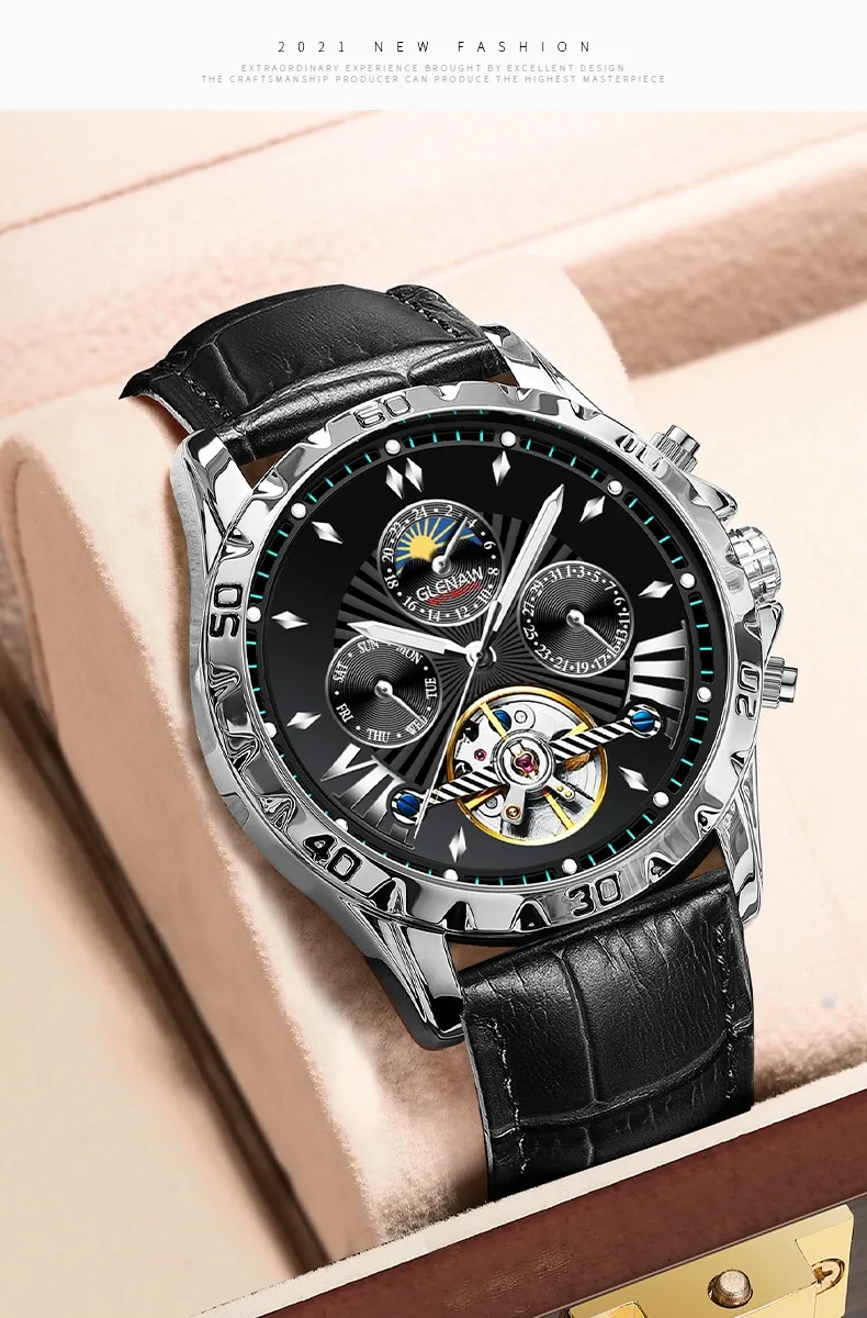 The case of this mechanical watch is crafted from high-quality stainless steel, providing a durable yet sleek finish. The polished surface of the case gives the watch a sophisticated, luxurious look, while the brushed steel adds a modern edge. Its robust construction ensures that it can withstand the rigors of everyday wear, making it both stylish and practical.