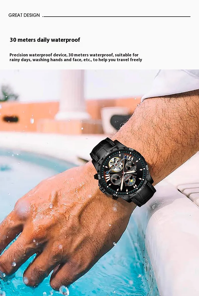 The Men's Fashion Hollowed-out Watch is powered by a self-winding automatic mechanical movement, eliminating the need for batteries. This movement is powered by the natural motion of the wearer’s wrist, ensuring that the watch remains accurate and ready to go at all times. It’s a perfect choice for watch enthusiasts who appreciate the intricate mechanics of automatic timepieces.