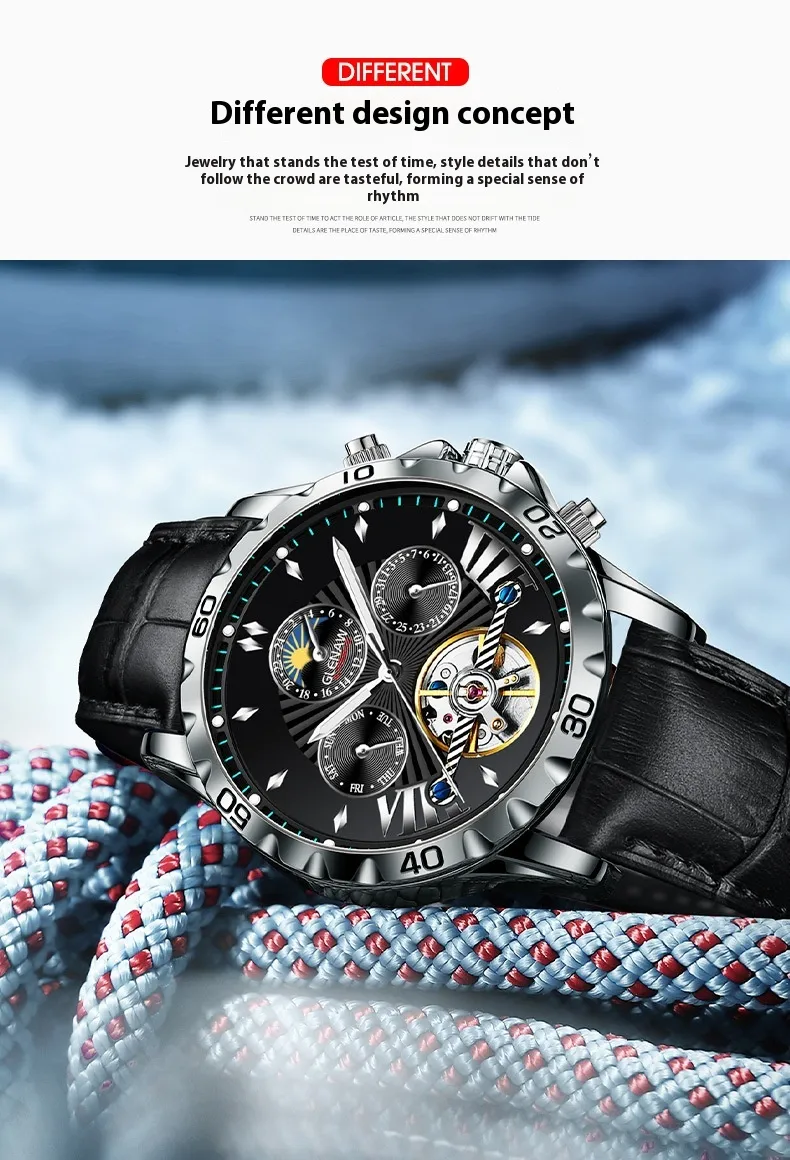 One of the standout features of this watch is its hollowed-out dial. The transparent design allows you to view the movement of the watch’s internal mechanics, offering a captivating visual experience. The intricate design of the gears and springs adds a level of sophistication and technical appeal, making this timepiece not only functional but also a conversation starter.