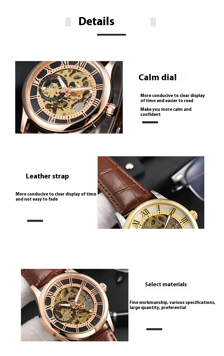 This watch features an automatic mechanical movement, which means it is powered by the natural motion of your wrist. The self-winding mechanism eliminates the need for batteries, ensuring reliability and eco-friendliness. The intricate internal mechanics are visible through the watch's case back, offering a glimpse into the art of watchmaking.