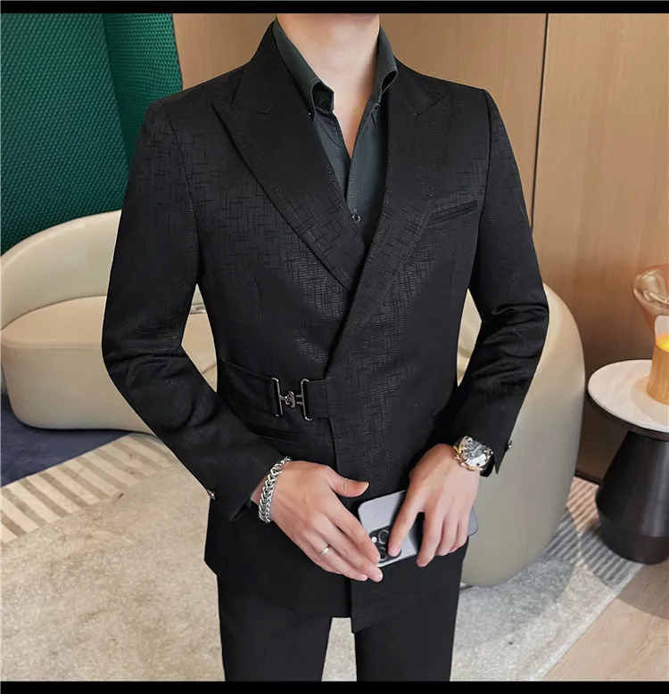 The Men's Suit Metal Buckle Design Gun Collar Jacket combines contemporary style with timeless sophistication, making it the perfect choice for those looking to elevate their formal wardrobe. With a unique gun collar and an edgy metal buckle design, this jacket stands out from the crowd while still maintaining a polished, professional appearance. Whether you’re attending a business meeting, a formal dinner, or a stylish event, this jacket offers the perfect balance of modern flair and classic elegance, ensuring you make a lasting impression.