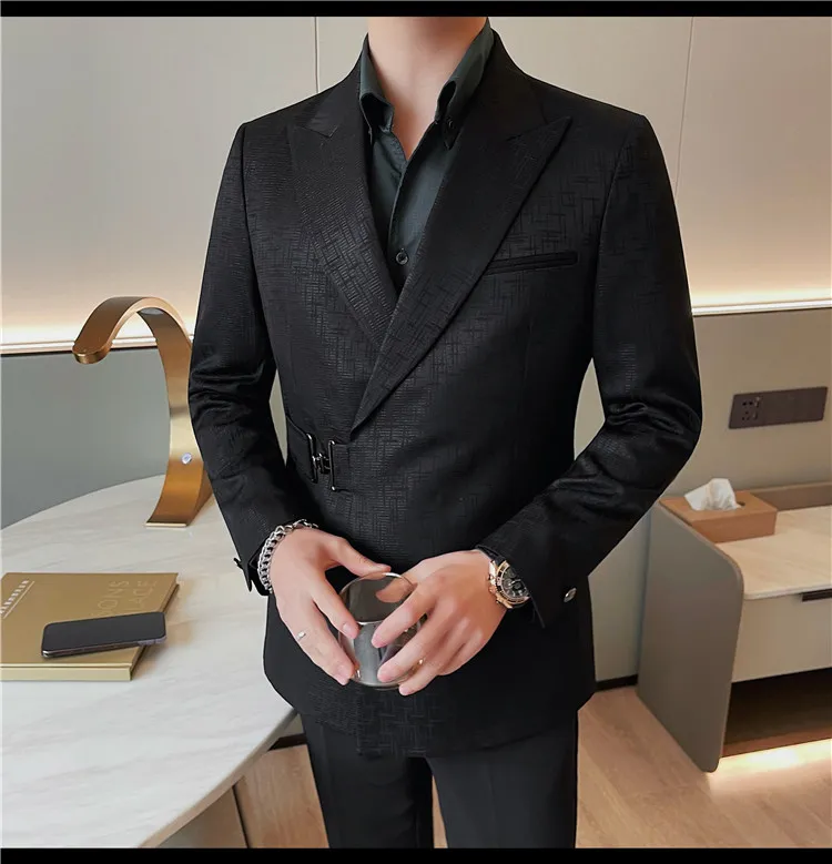 The Men's Suit Metal Buckle Design Gun Collar Jacket is a must-have for anyone looking to make a statement with their formal attire. Its bold design, coupled with the high-quality fabric and tailored fit, provides the perfect blend of style, comfort, and sophistication. Whether you're attending a corporate event, a social gathering, or a formal dinner, this jacket ensures that you look sharp and stylish. Elevate your wardrobe with this unique piece and embrace a fresh take on traditional men's fashion.