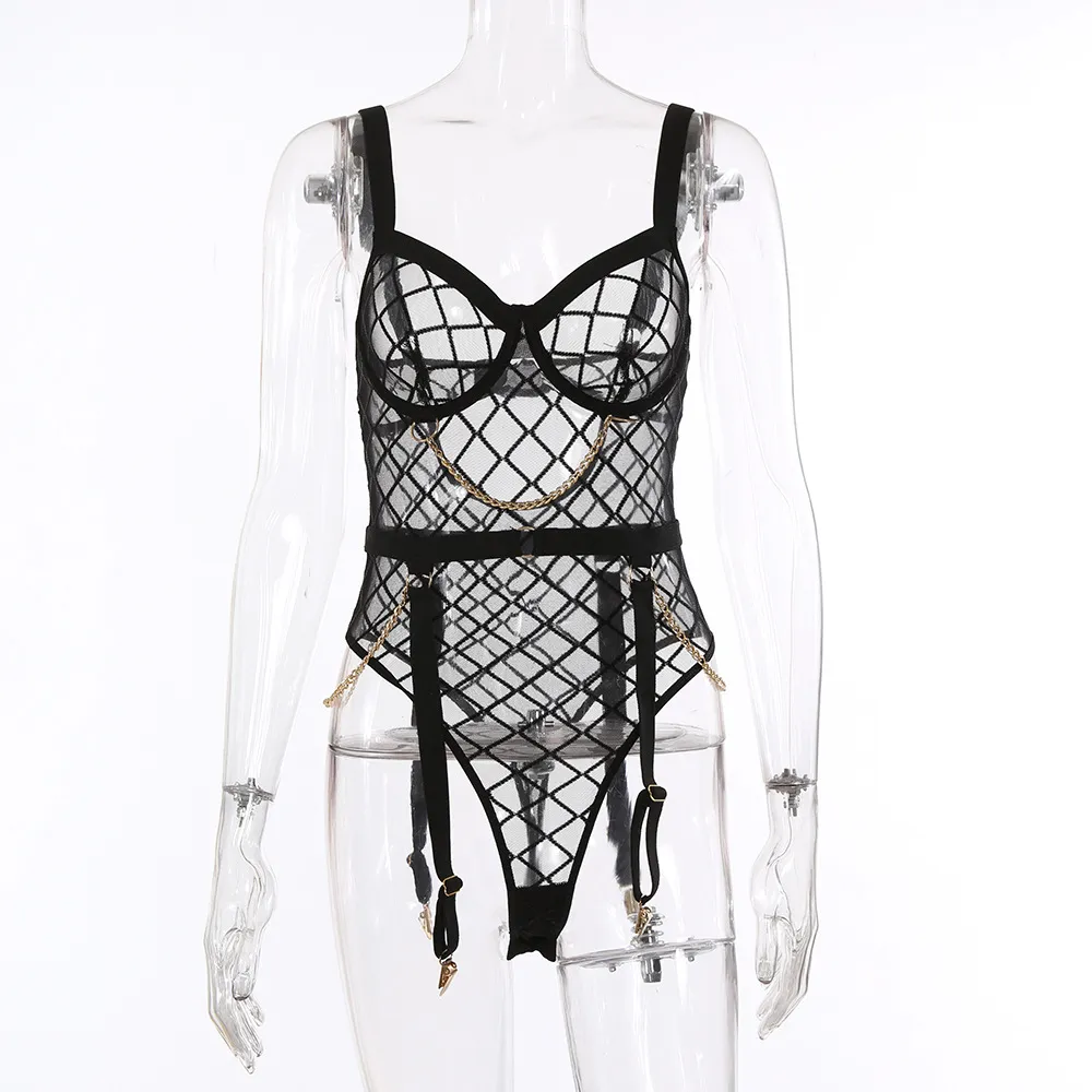 What sets this lingerie set apart from others is the addition of metal chain accents. These chains add an edgy, modern touch to the design, creating a bold contrast with the soft mesh fabric. The chain details provide a structured, daring element, making this set perfect for women who want to combine sophistication with a hint of rebellion.