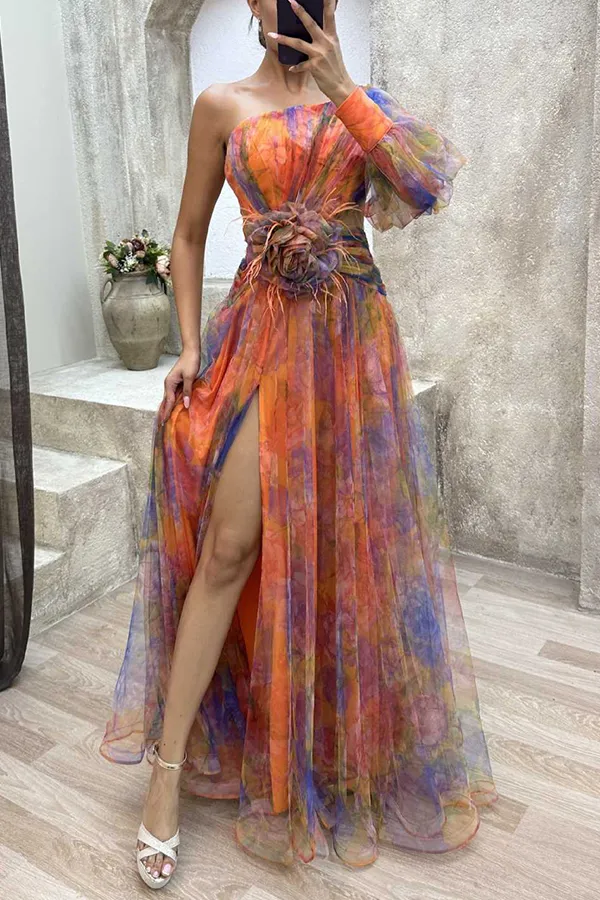 Mesh Tie-dye Printed Off-shoulder Slit Dress Summer INS Fashion Long Dress Party Womens Clothing