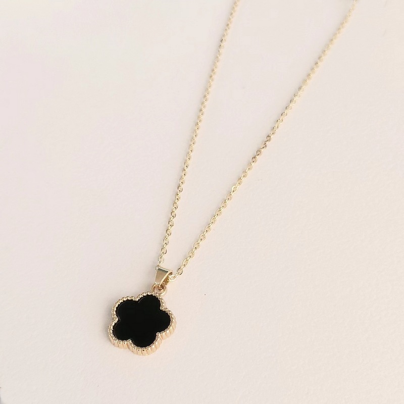 Description: Introducing the Midnight Clover Pendant Necklace, a sophisticated and elegant piece designed to add a touch of timeless beauty to any ensemble. This exquisite necklace features a stunning black clover-shaped pendant, delicately framed with intricate golden beading. The sleek and polished design of the clover pendant exudes a sense of mystery and charm, making it a perfect accessory for both casual and formal occasions.
