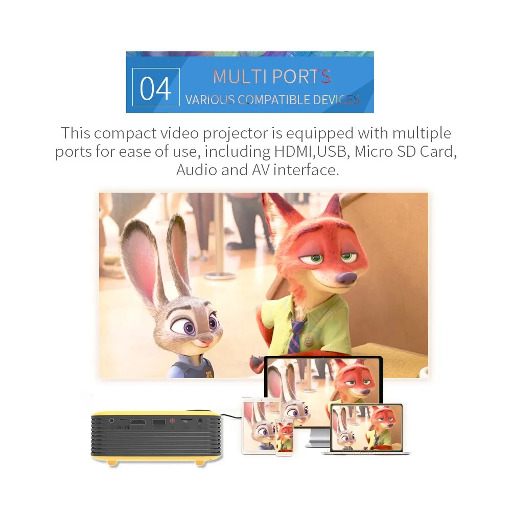 The built-in eye-care technology reduces strain on your eyes, allowing you to enjoy extended viewing sessions without discomfort. The projector is designed for easy setup and can be used in a variety of environments, from home theaters to outdoor movie nights, offering a flexible and fun viewing experience. Compact and lightweight, this LCD projector is ideal for small spaces and on-the-go usage, offering high-quality visuals in a portable package.