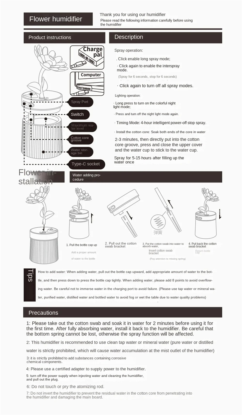 Enhance the air quality in your personal spaces with our Flower Shape Humidifier. Designed for small homes, bedrooms, offices, and dorm rooms, this quiet mini USB humidifier offers efficient hydrating and water purification, all while adding a decorative touch to your environment. Perfect for users in New Zealand, this compact and stylish humidifier ensures your space remains comfortable and healthy.Overview:
