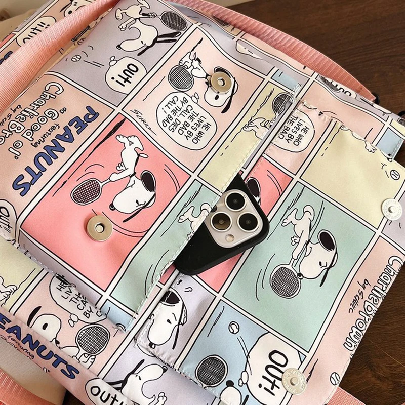 The bag showcases a charming Snoopy cartoon print that adds a whimsical touch to its design. The vibrant pink nylon material enhances the bag's aesthetic appeal, creating a stylish and fashionable accessory. The large, colorful Snoopy print is complemented by sleek, minimalistic detailing, ensuring that the bag stands out while remaining versatile enough to pair with a variety of outfits. The bag's nylon fabric offers a smooth and shiny finish, adding to its modern look.