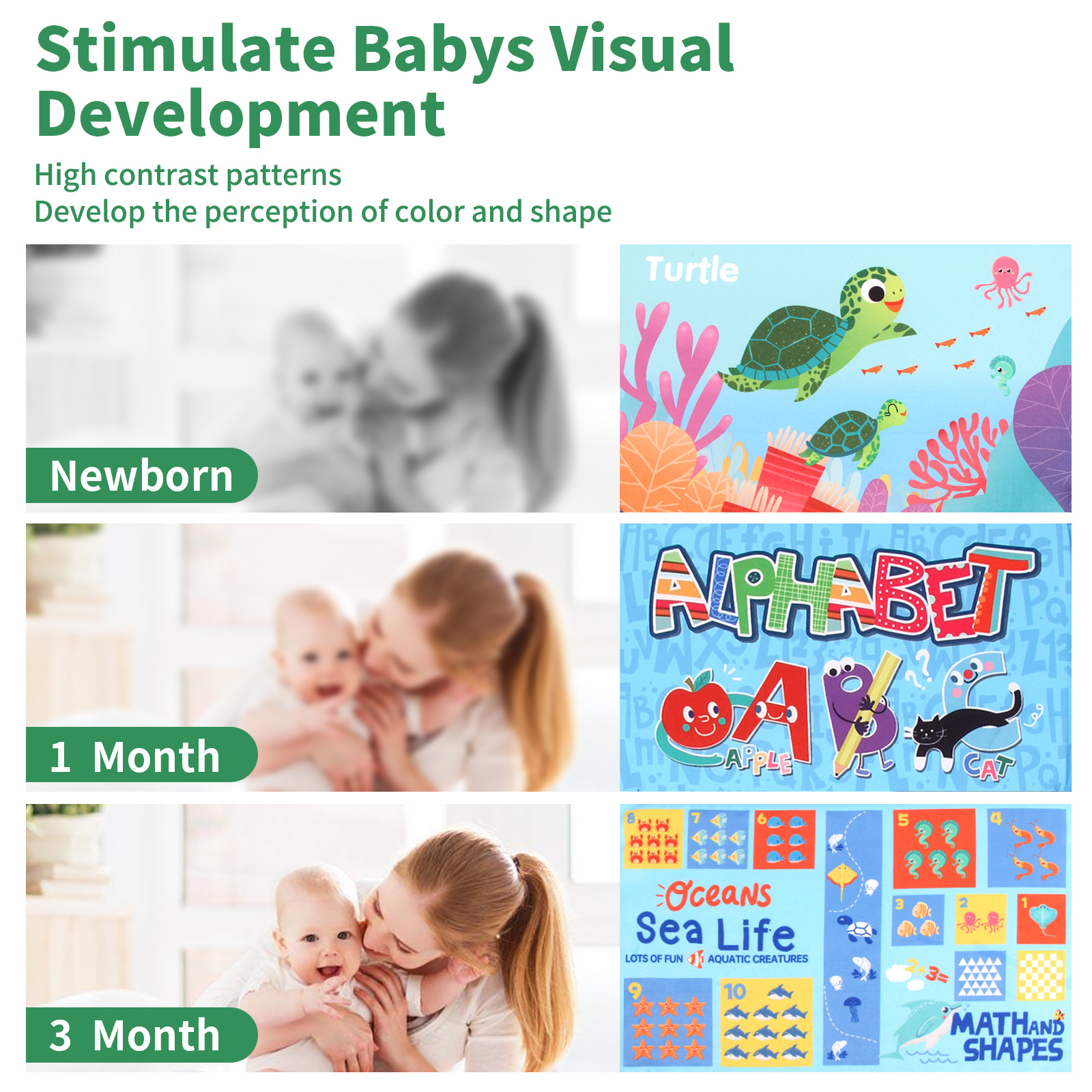 focus and explore new visual stimuli. The bright, engaging images will encourage babies to look, touch, and explore.