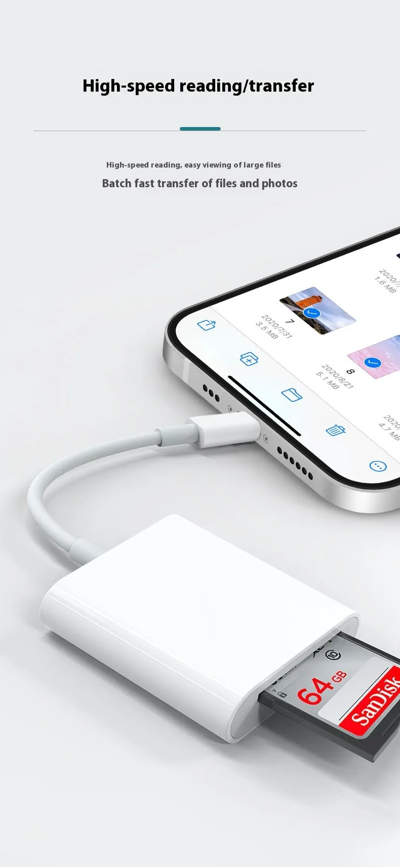 The Mobile Phone Applicable Camera Card Reader Adapter OTG Data Cable is a must-have tool for anyone looking to streamline their data transfer process between mobile devices and external storage. Whether you're a photographer, videographer, or just someone who needs to move large files quickly, this adapter provides the perfect solution. With its OTG connectivity, high-speed transfer, and compact design, it offers convenience and efficiency for managing your files on the go. Say goodbye to complicated transfers and enjoy fast, reliable data management with this essential adapter.