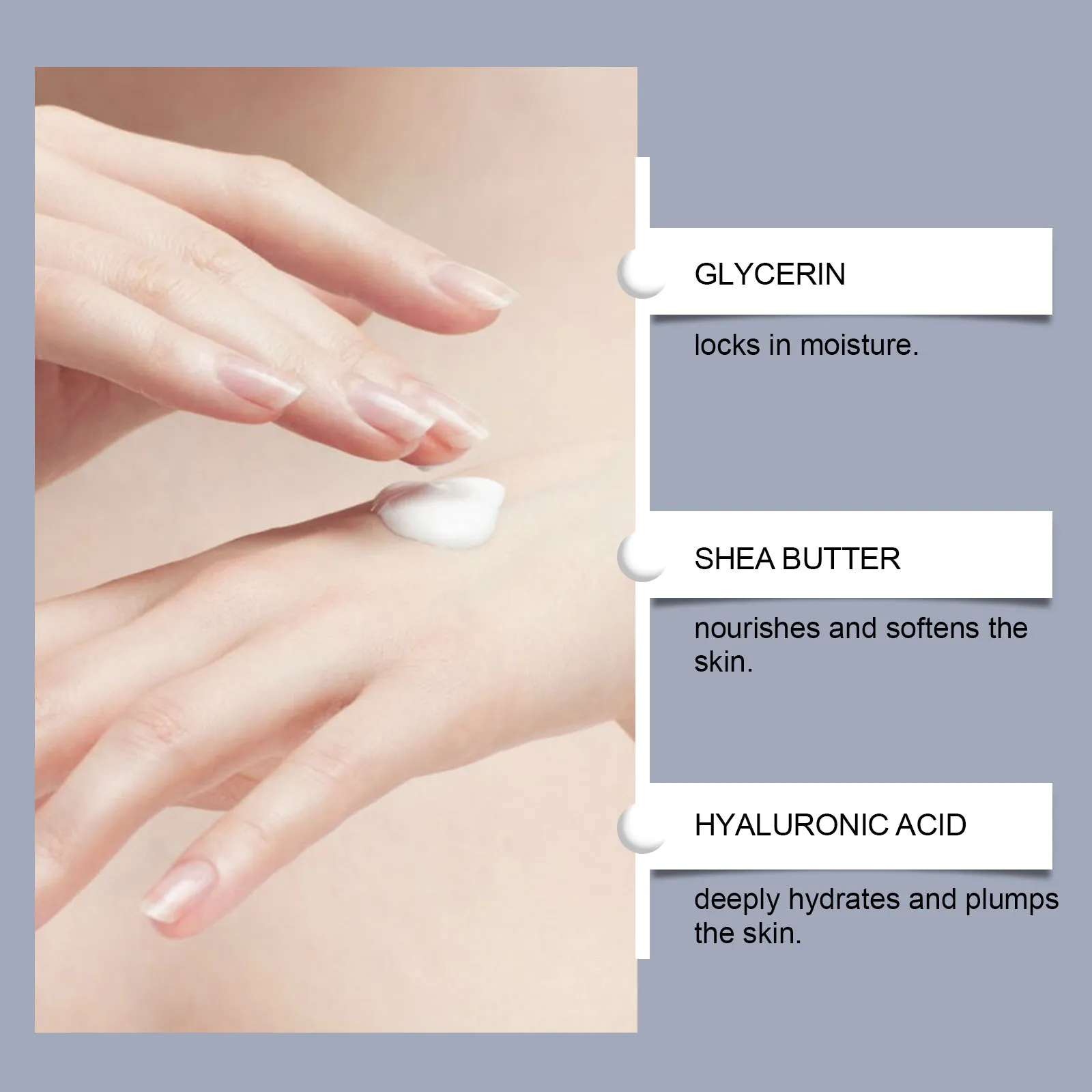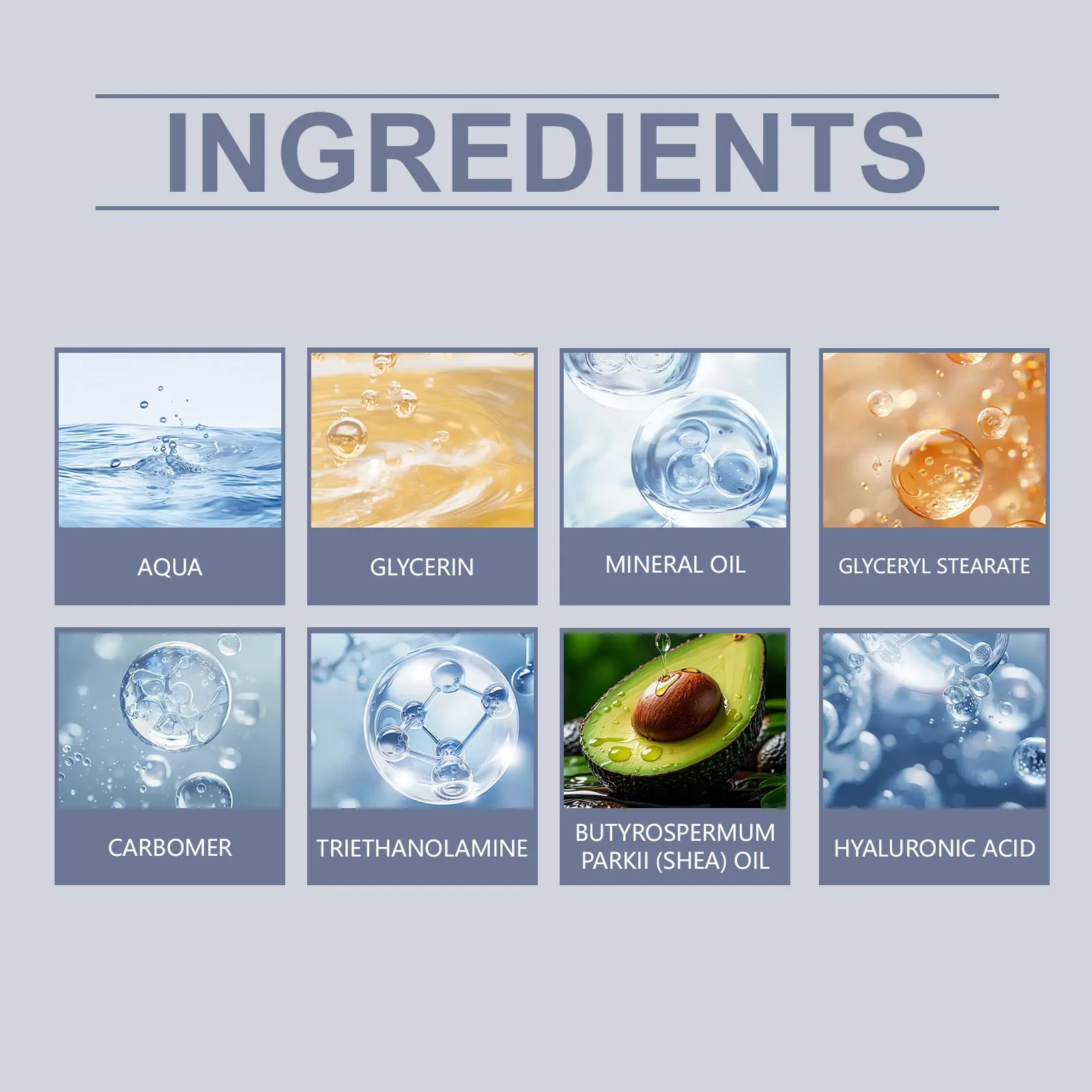 Component :Water, Glycerin, Mineral Oil, Glyceryl Stearate, Carbomer, Triethanolamine, Butter Fruit Tree Oil, Hyaluronic Acid