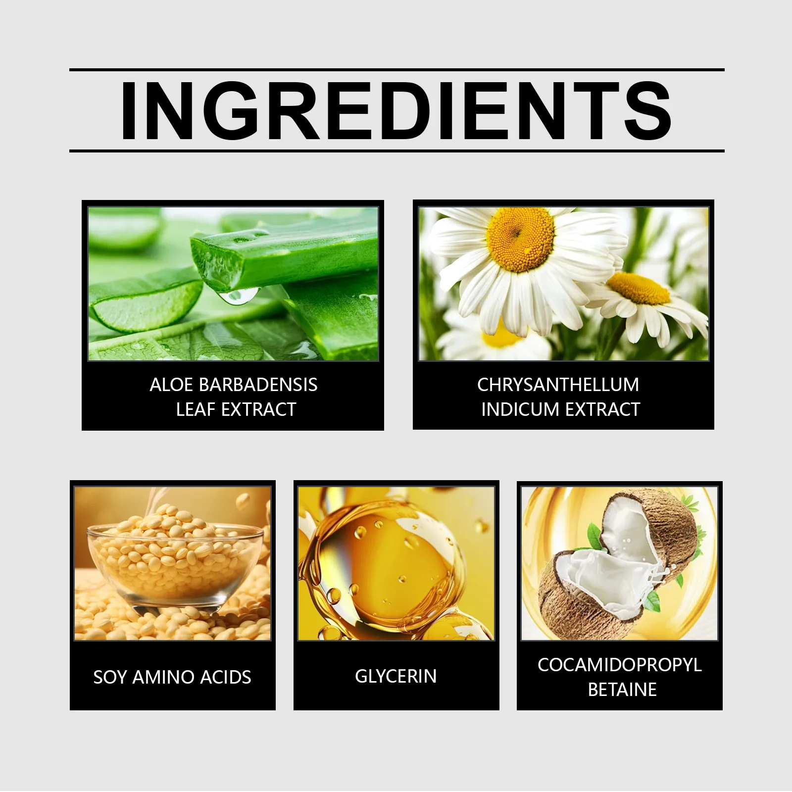 Ingredients: glycerol, soybean amino acid, aloe extract, chamomile extract, coconut oil amidopropyl Betaine