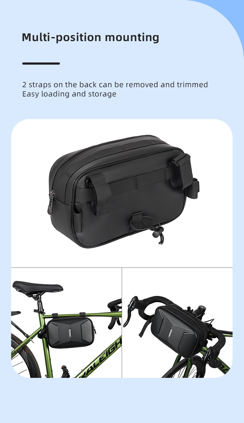 Installation is quick and hassle-free, thanks to the intuitive mounting system that securely attaches the bag to your bike's front frame. Once in place, the bag remains firmly fixed, providing a stable and reliable storage solution that won't impede your riding experience.