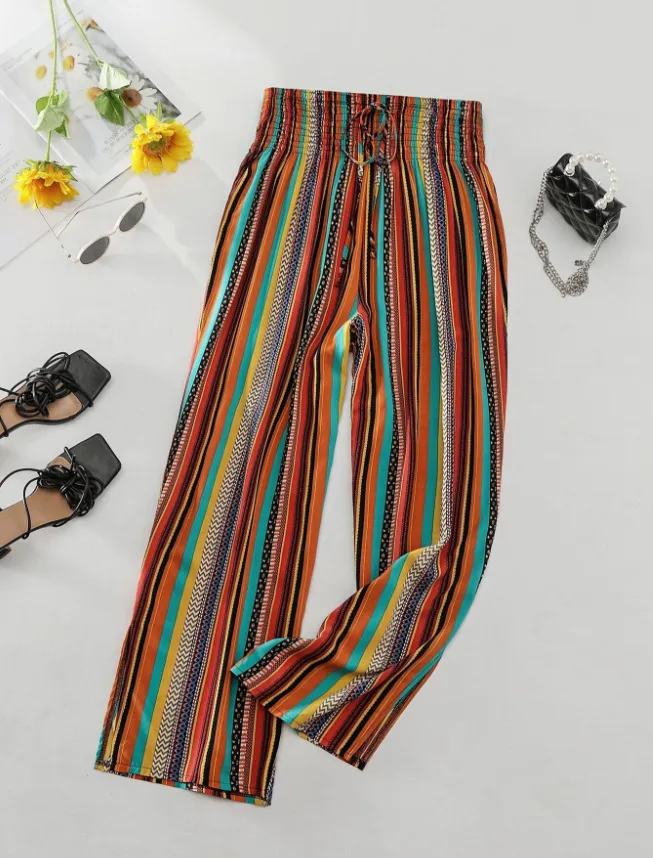 Multi-color Stripe Women's Casual Pants Tied Elastic Waist