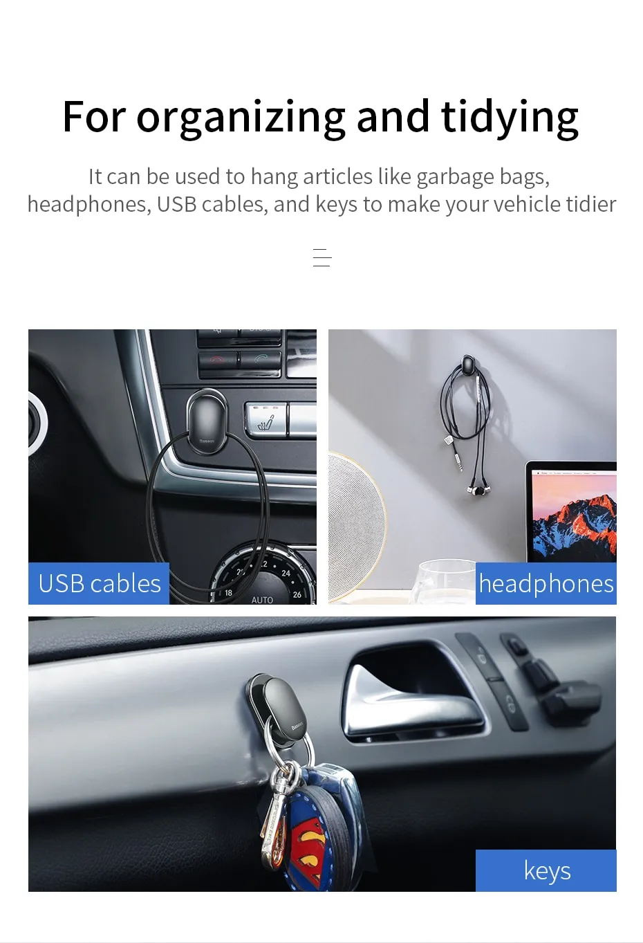 Il peut être utilisé pour accrocher des articles comme des sacs à ordures, des écouteurs, des câbles USB et des clés pour rendre votre véhicule plus rangé.