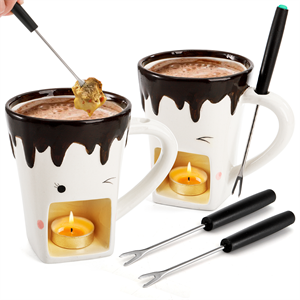 - 2 sets of ceramic fondue mug with 4 stainless steel forks, size: 4" in top diameter, 5" in height. Individual fondue mug is suitable to serve customers in the party. Dishwasher-safe.
