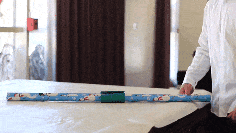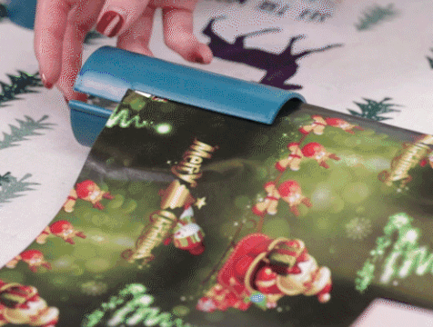 - Slide Wrapping Paper Cutter over the wrapping paper. Remember the device is flexible so it can be used on any size roll of paper.