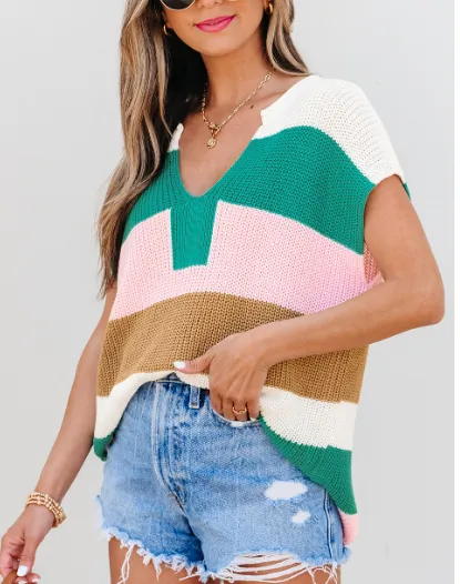 Multicolour Color Block Notch V Neck Sweater T-Shirt