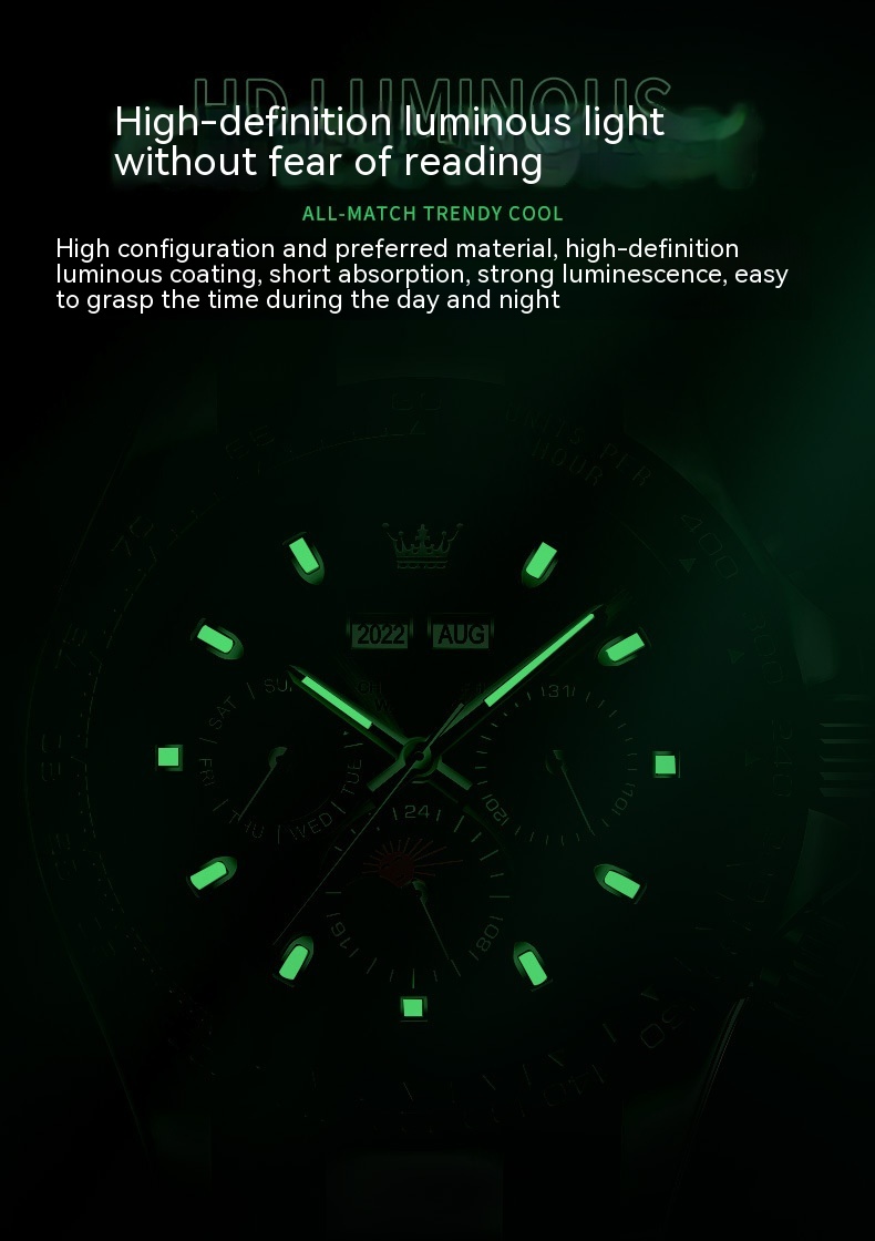 The TitanPulse Pro Multifunction Automatic Men's Watch combines precision engineering with sleek style. This luxurious timepiece features a stainless steel band and case, giving it a robust and classic look. The detailed dial includes a full calendar, chronograph functionalities, and a distinctive moon phase indicator, enhancing its sophistication. With water resistance and a tachymeter scale on the bezel, this watch is designed for both everyday wear and special occasions. It's an ideal accessory for the modern man who appreciates elegance and functionality in his timekeeping tools.