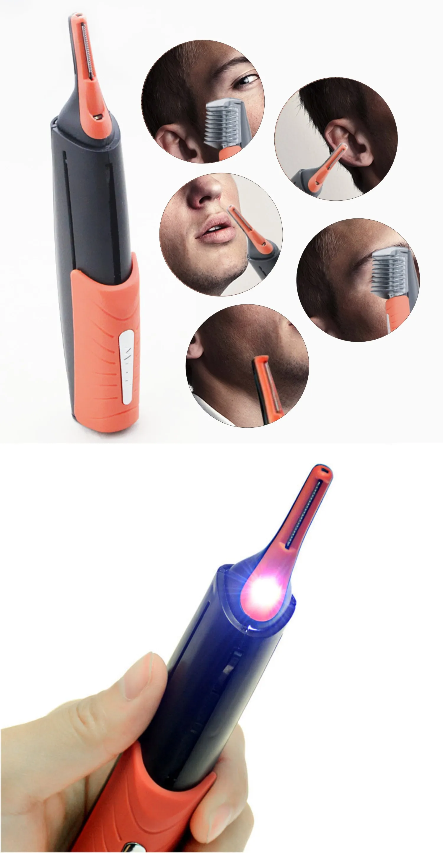 - Dual-function grooming tool: nose hair trimmer and eyebrow shaver