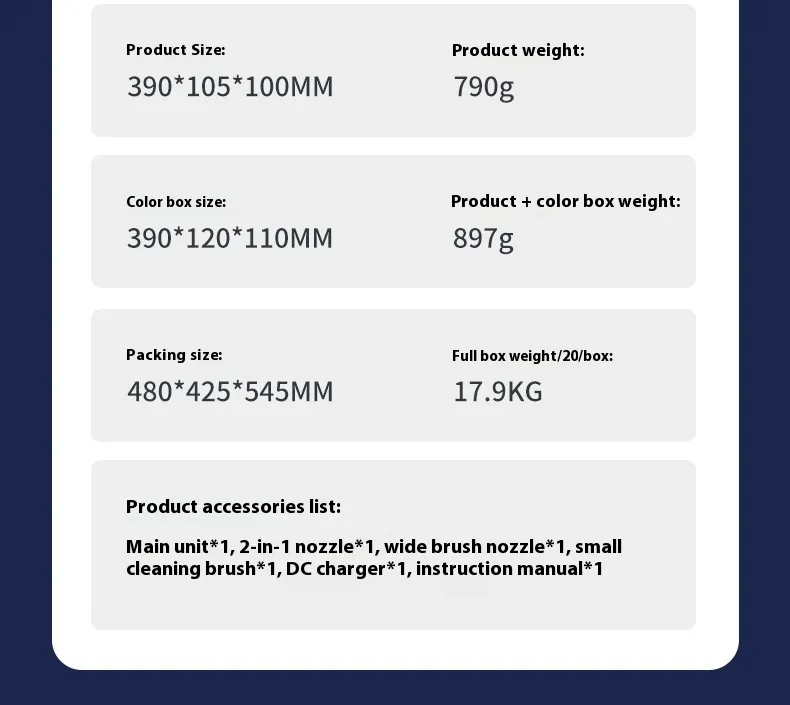 Host 1, 2-in-1 suction nozzle 1, wide brush suction nozzle 1, cleaning brush 1, DC charger 1, instruction manual 1