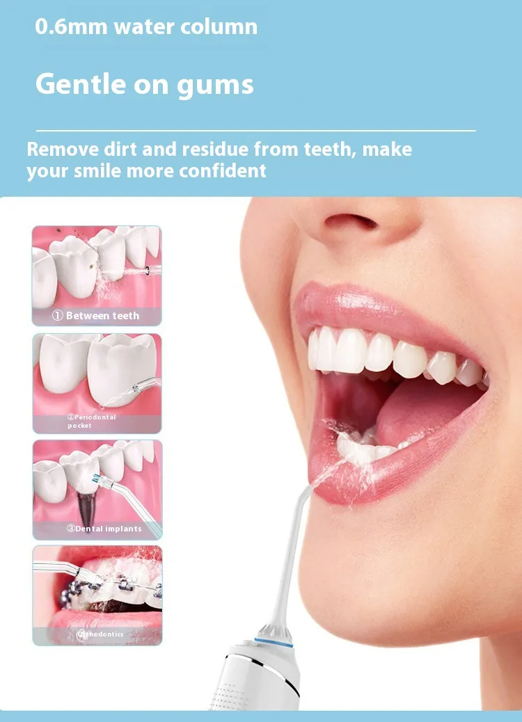 Enhanced Oral Hygiene: The high-pressure water jet removes plaque, food particles, and bacteria from areas that are hard to