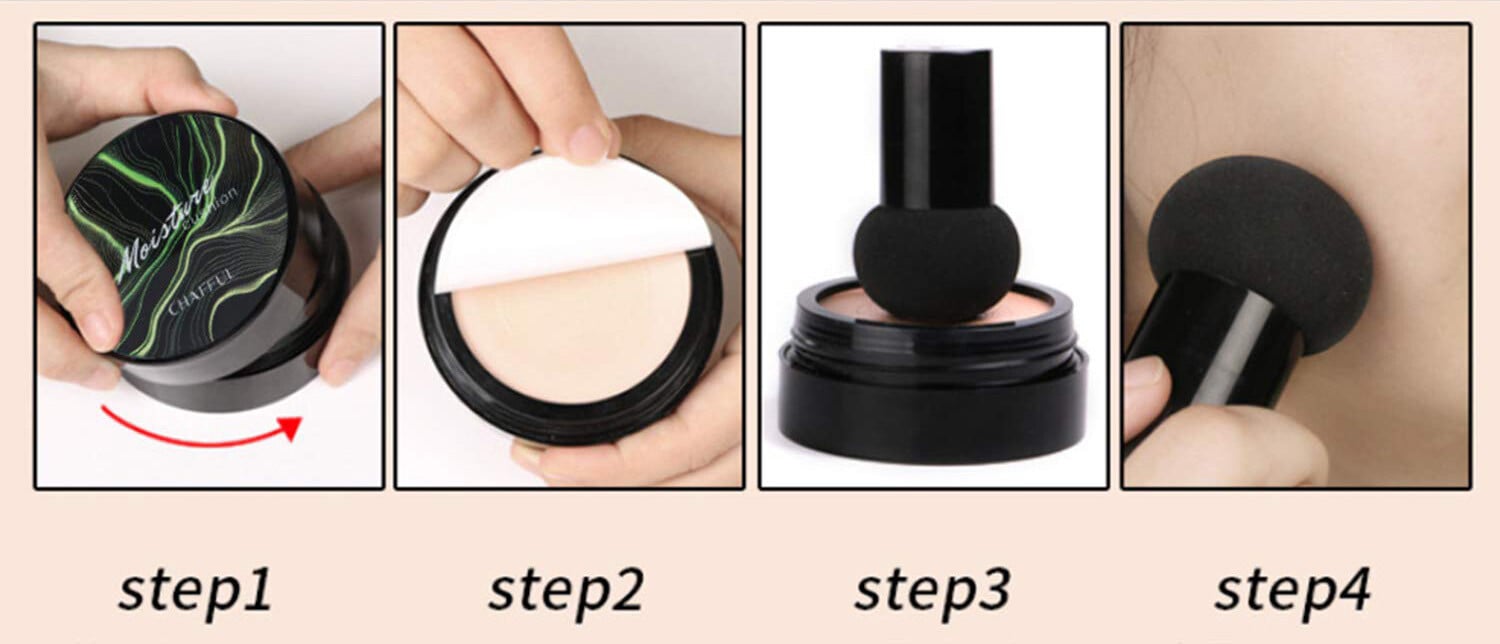 STEP2Using small mushroom puff and softly press the correct volume of substance uniformly on the face.NOTE: Before usage, wash the sponge with water and it will become soft and moist, so the cream can be added better. |