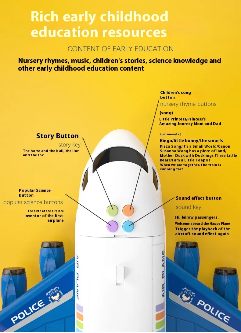 A cartoon airplane that tells a story and children’s song,the children to play with, helping them to develop their coordination skills. Train the ability of children’s hands and feet coordination,strengthen the communication of companions.
