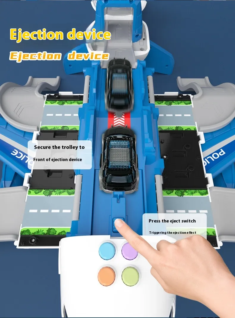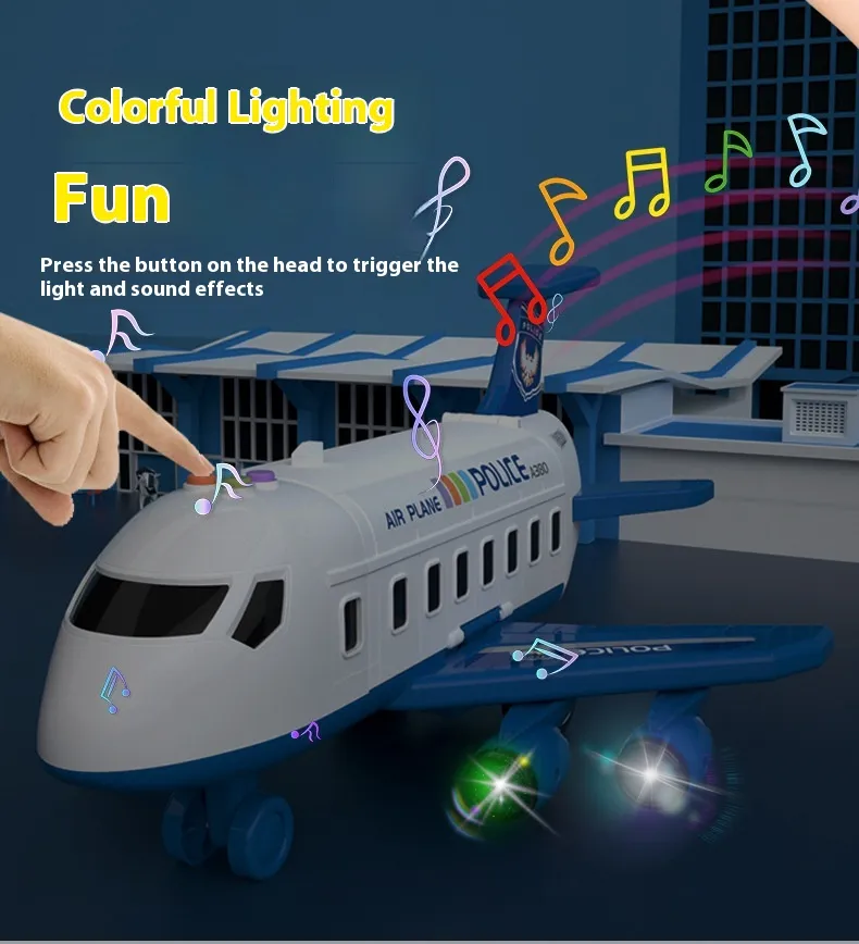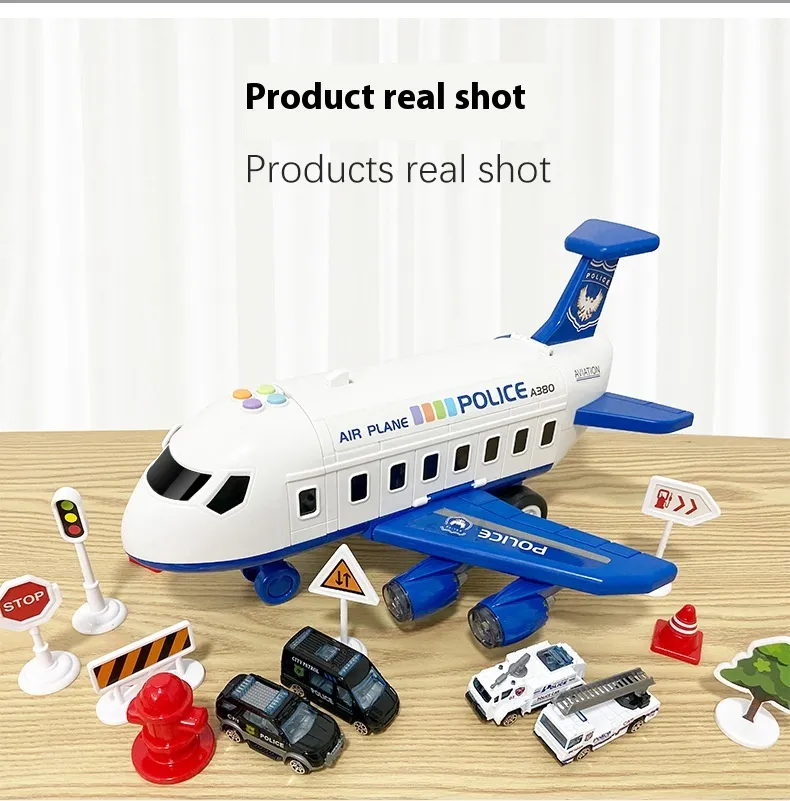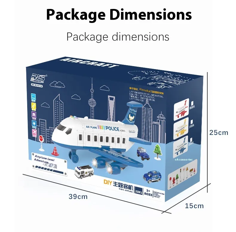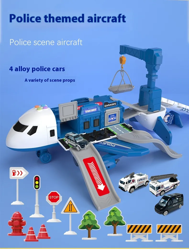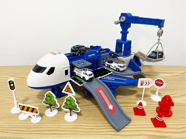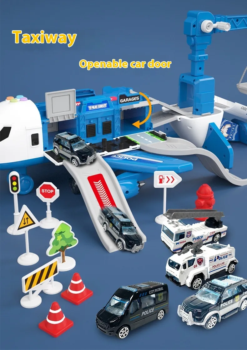 Music Story Simulation Track Inertia Aircraft is a multi-component toy playset that combines an aircraft, airport infrastructure, police vehicles, and interactive accessories into one cohesive imaginative environment. Unlike simple standalone toys, this set is designed as a story simulation system, allowing children to invent scenarios involving aircraft operations, airport logistics, rescue missions, and police coordination.