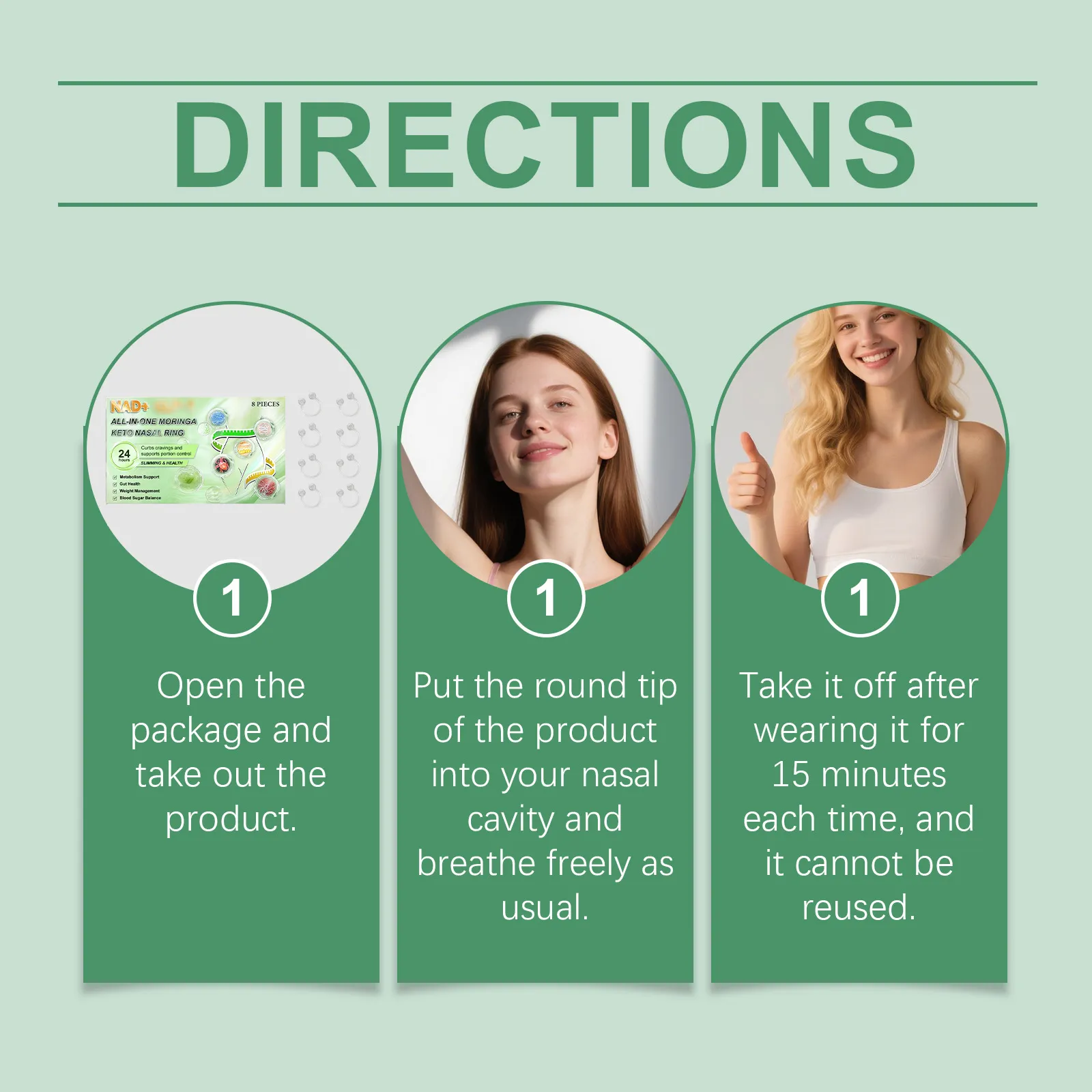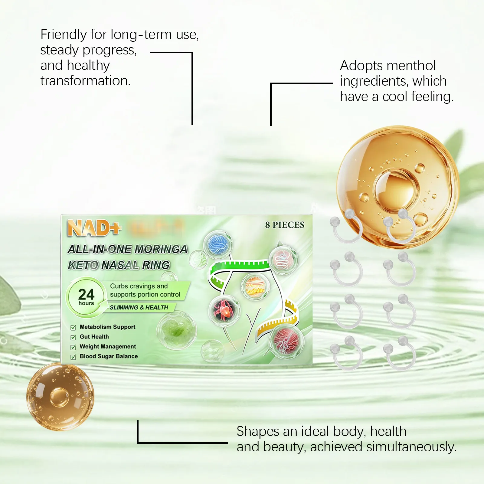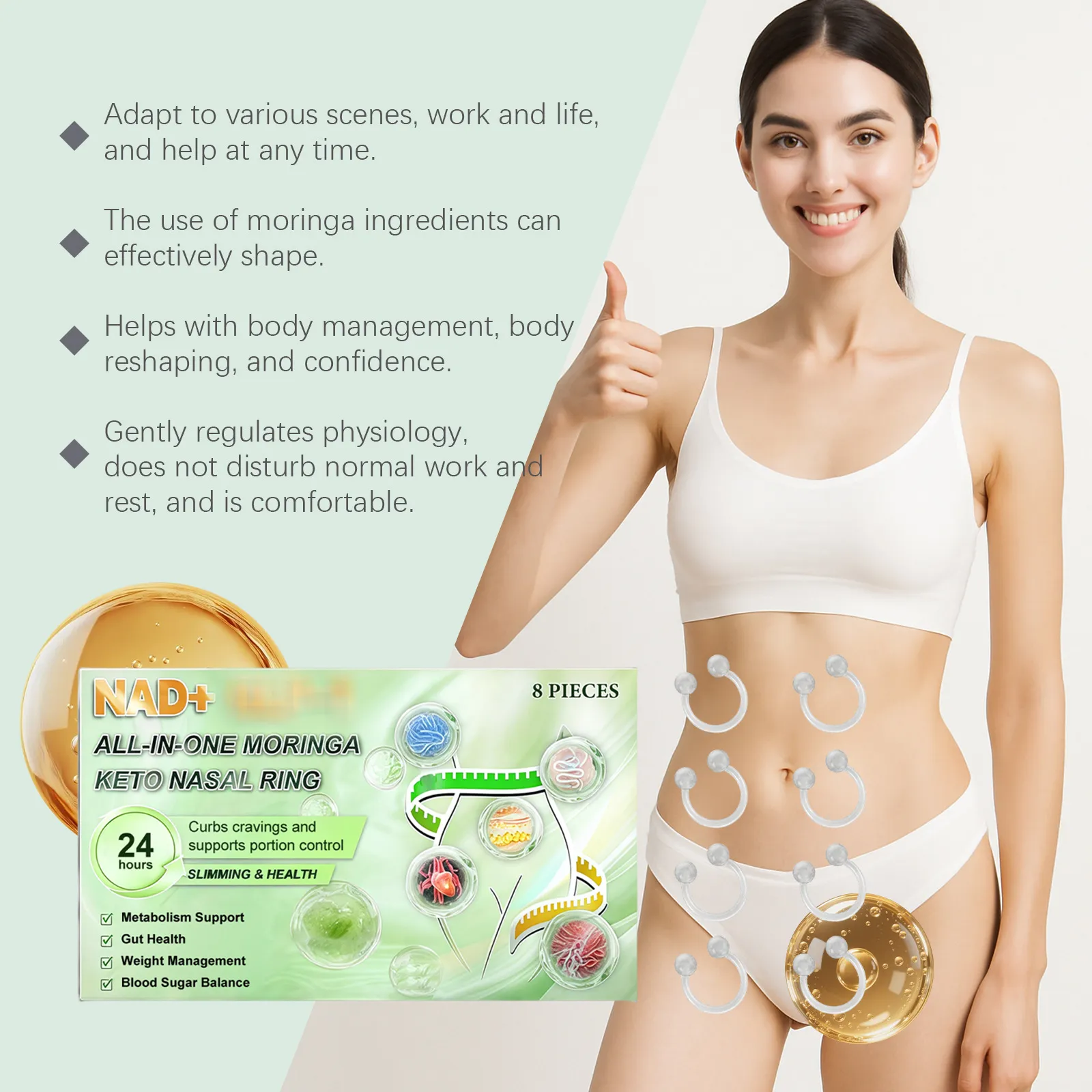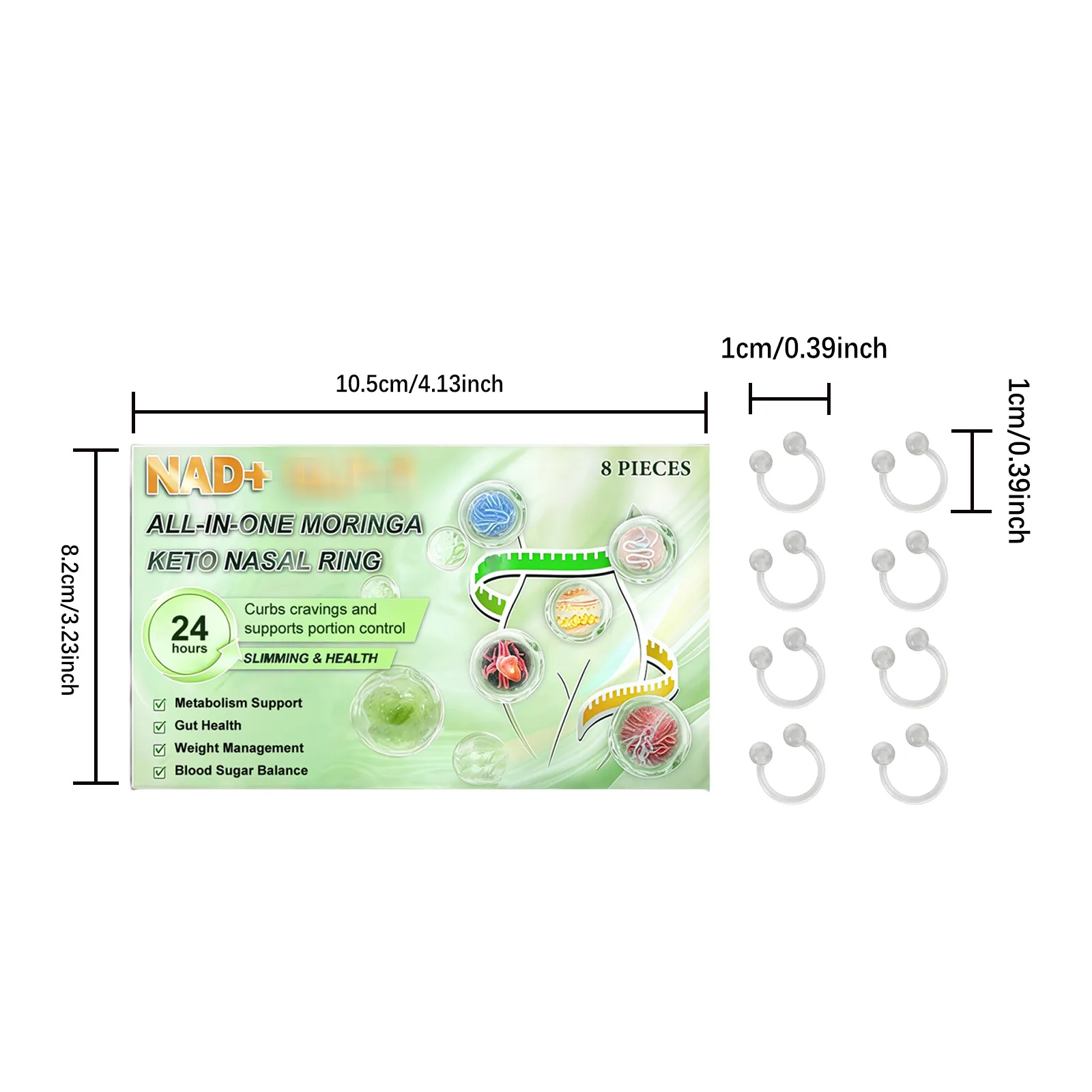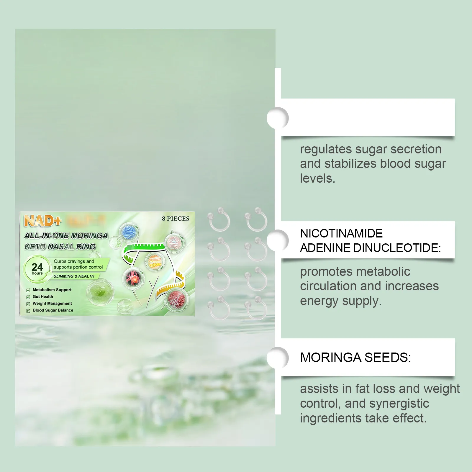 The NAD+ All-In-One Moringa Keto Nasal Ring offers a natural and easy way to curb cravings, support weight management, and enhance overall well-being. This product contains 8 nasal rings, each designed to help control appetite, promote healthy eating habits, and maintain balance in your metabolic processes. The rings are formulated with Moringa, known for its numerous health benefits, including metabolism support, blood sugar balance, and improved gut health.