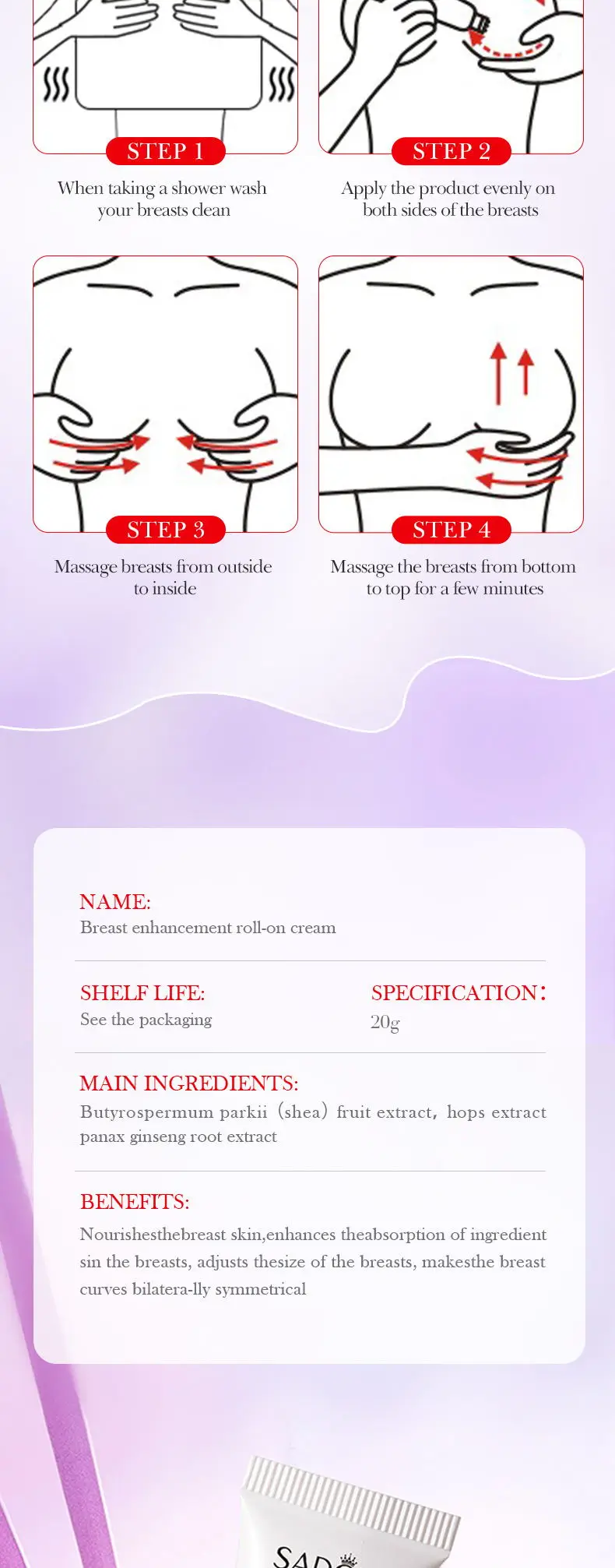 This natural breast enlargement cream is designed to lift and firm the breasts, improve sagging, and promote rapid growth. Formulated with natural ingredients, it provides effective body care through regular massage, enhancing the size and appearance of your chest.