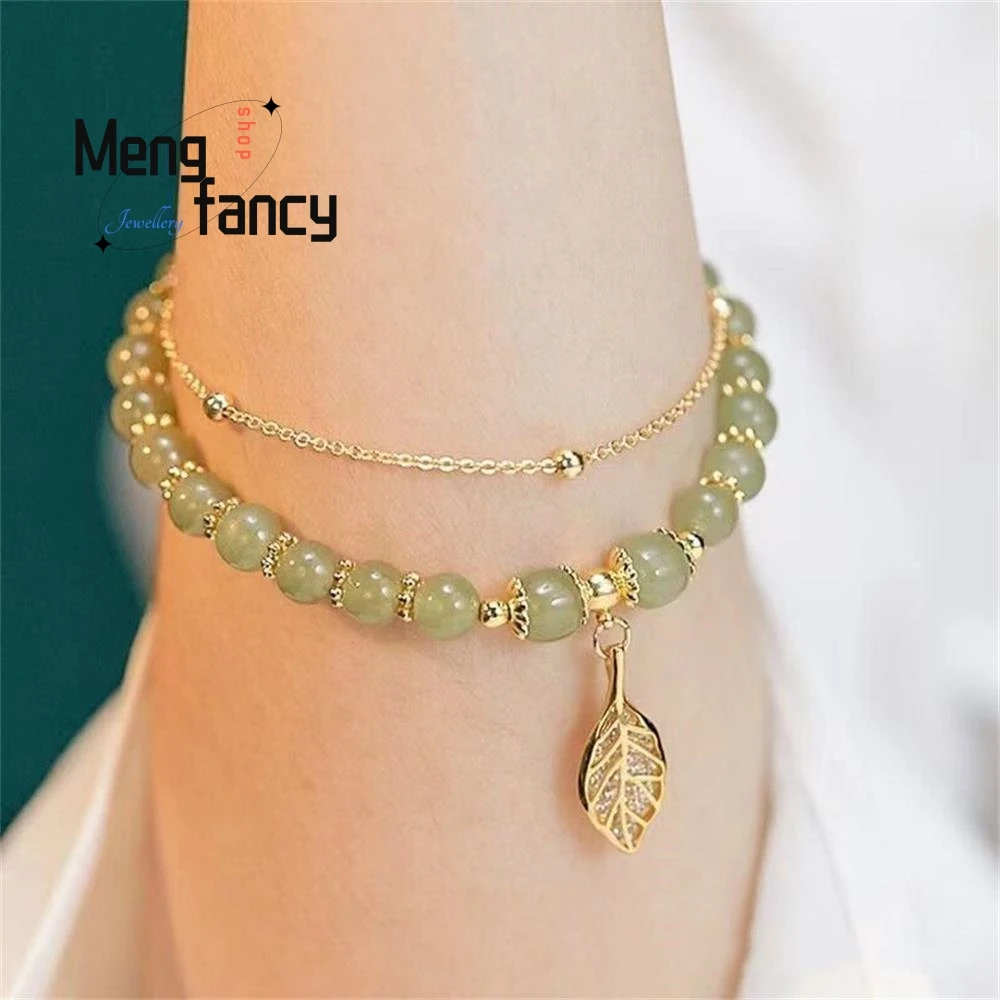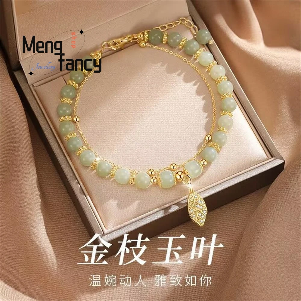 Natural Hetian Jasper Bracelet Golden Branch & Jade Leaves Charm