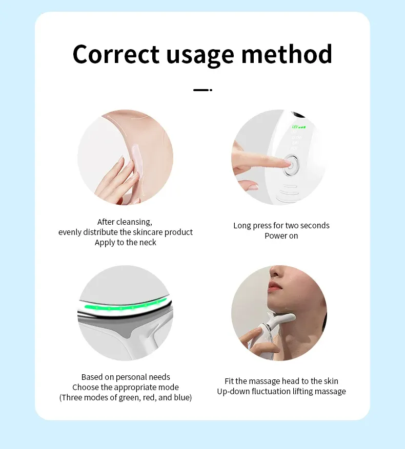The ergonomic design allows for comfortable handling and targeted treatment of the neck and face areas. Simply select the appropriate light