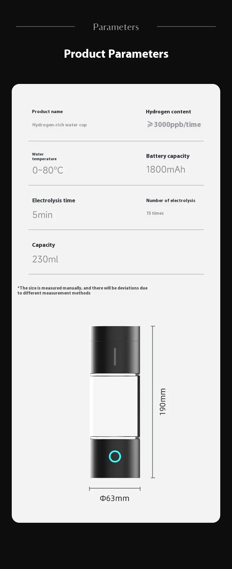 The Hydrogen-rich Water Boiled Water Cup features a sleek, modern design, making it an essential health accessory for daily use. Its durable construction and advanced electrolysis system ensure long-lasting performance and reliability.
