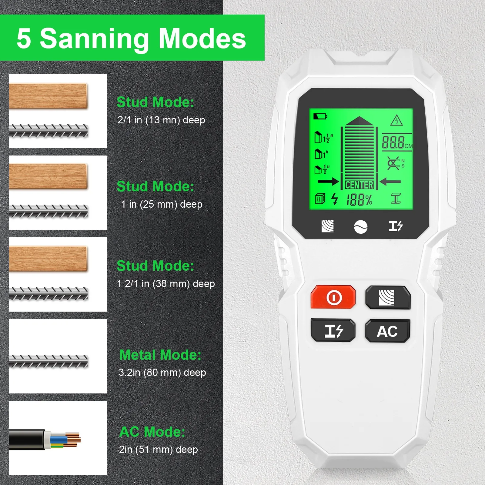 The New 5-in-1 Wall Detector is designed with ergonomics in mind, offering a lightweight and comfortable grip for extended use. Its compact size ensures that it can be easily handled during long scanning sessions, making it ideal for homeowners, contractors, and anyone working in tight spaces or hard-to-reach areas.