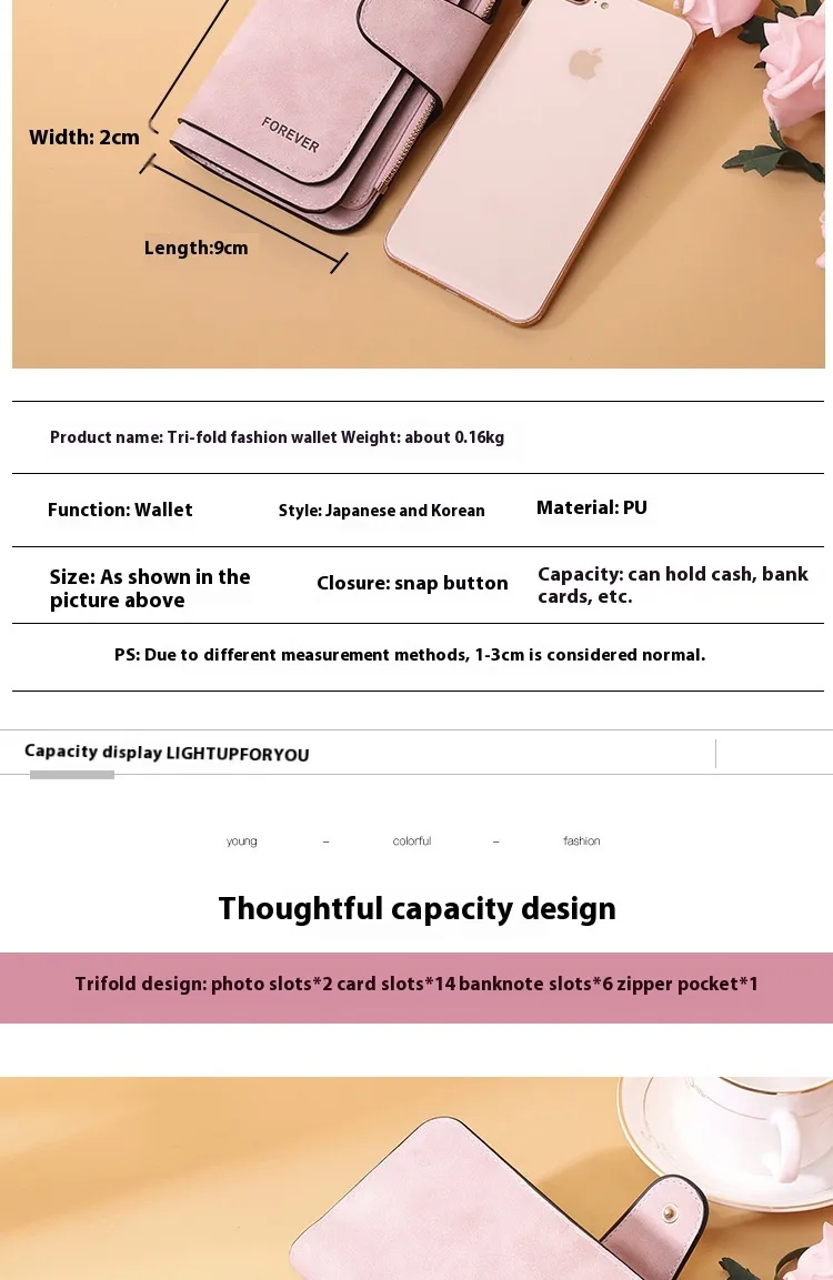 In conclusion, the New Buckle Women's Long Wallet Three Fold Fashion Women's Bag Multi-card Women's Purse Frosted Two-tone Fabric is a must-have accessory for the modern woman. With its stylish buckle closure, durable frosted two-tone fabric, and spacious interior, it combines elegance and practicality to keep all your essentials organized. This wallet is the perfect choice for any woman who appreciates style, functionality, and lasting quality.