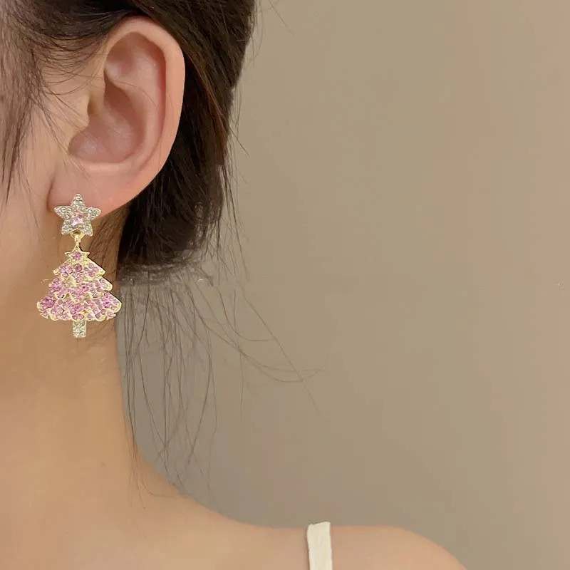 Inspired by the spirit of Christmas, these earrings are shaped like a Christmas tree, decorated with intricate zircon stones that shimmer beautifully in the light. The design captures the joy and elegance of the season, making them a standout piece for any holiday ensemble. Whether you're wearing them to a party or a family gathering, these earrings will add a festive touch to your outfit.