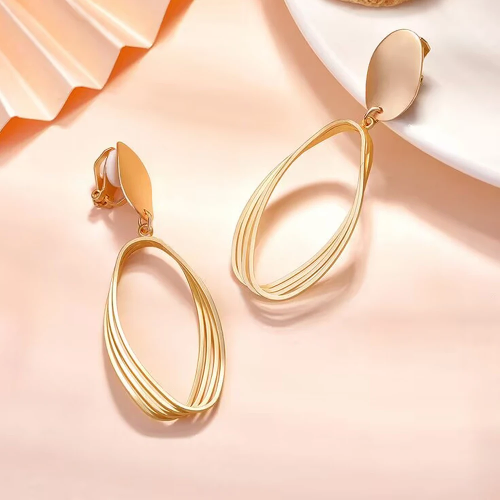 New Geometry Retro Metallic Gold Color Multiple Oval Pendant Clip Earrings