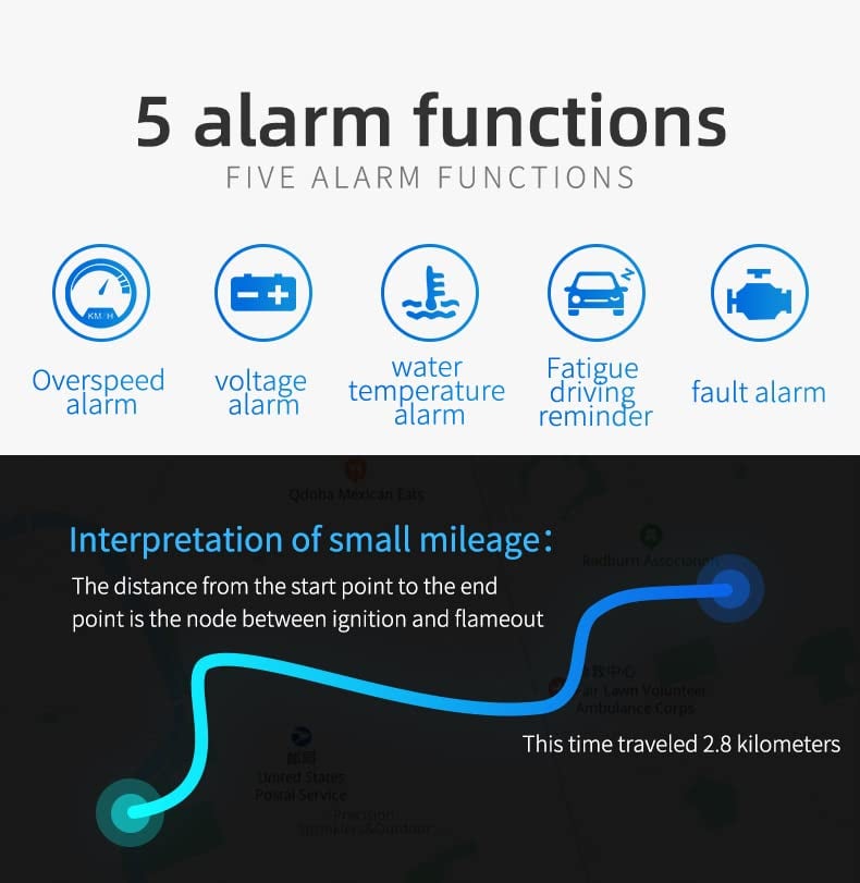 đăFive Alarm FunctionsăOverspeed alarm, voltage alarm, water temperature alarm, fatigue driving, fault alarm.