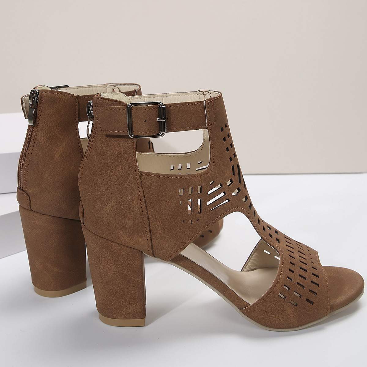 New High Square Heel Hollow Roman Shoes With Back Zipper For Women