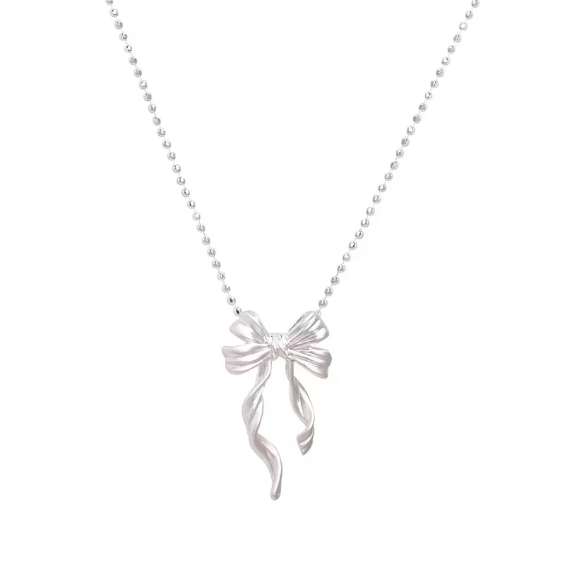 The pendant’s intricate craftsmanship creates a graceful yet bold statement, with the ribbon-like curves of the bow wrapping elegantly around the beads chain. Its symmetry and proportional balance create an aesthetically pleasing effect, ensuring that the bow remains the focus of attention. The design is understated yet refined, ideal for both formal and casual occasions.
