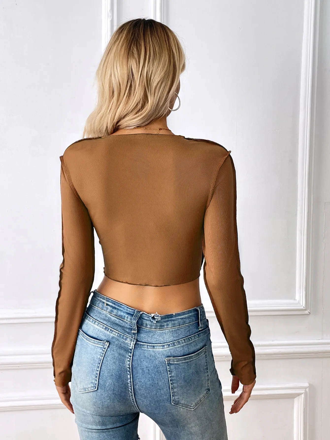 Crafted from a soft and stretchy fabric, this long sleeve crop top offers a comfortable and flattering fit that hugs your body, accentuating your curves while providing ease of movement. The exposed stitching detail runs along the seams, giving it a raw, unfinished look that’s both stylish and daring—perfect for fans of the Y2K aesthetic. The cropped length shows off your waist, making it ideal for pairing with high-waisted jeans, skirts, or shorts for a trendy, navel-baring style.