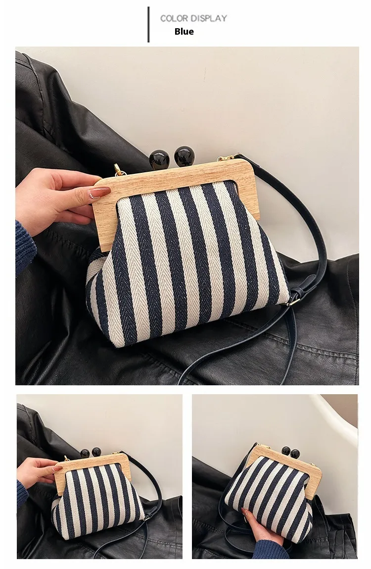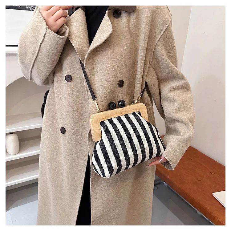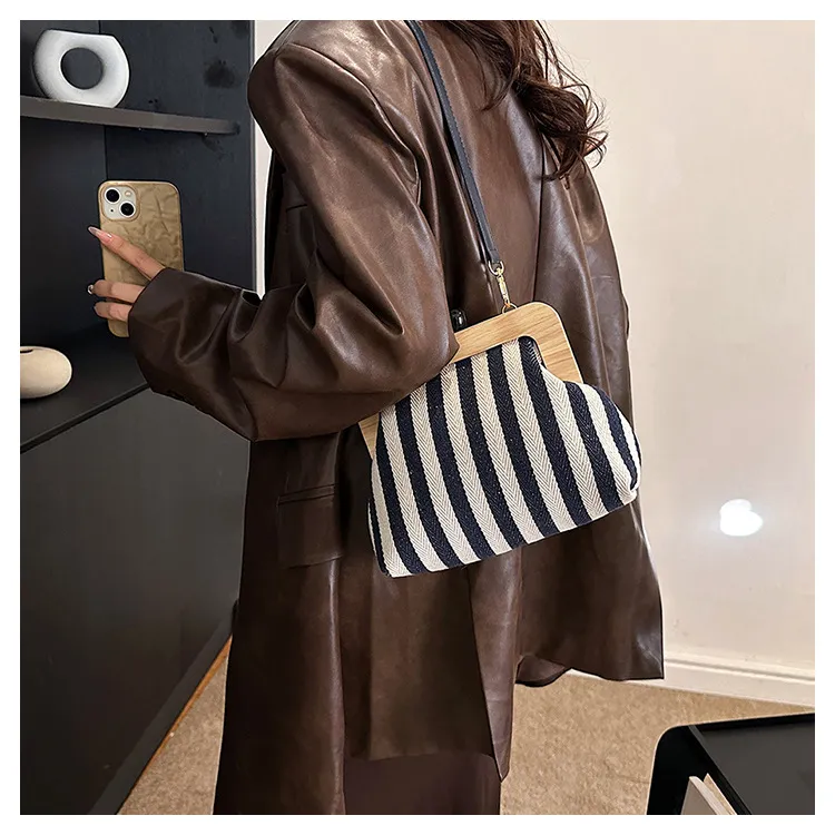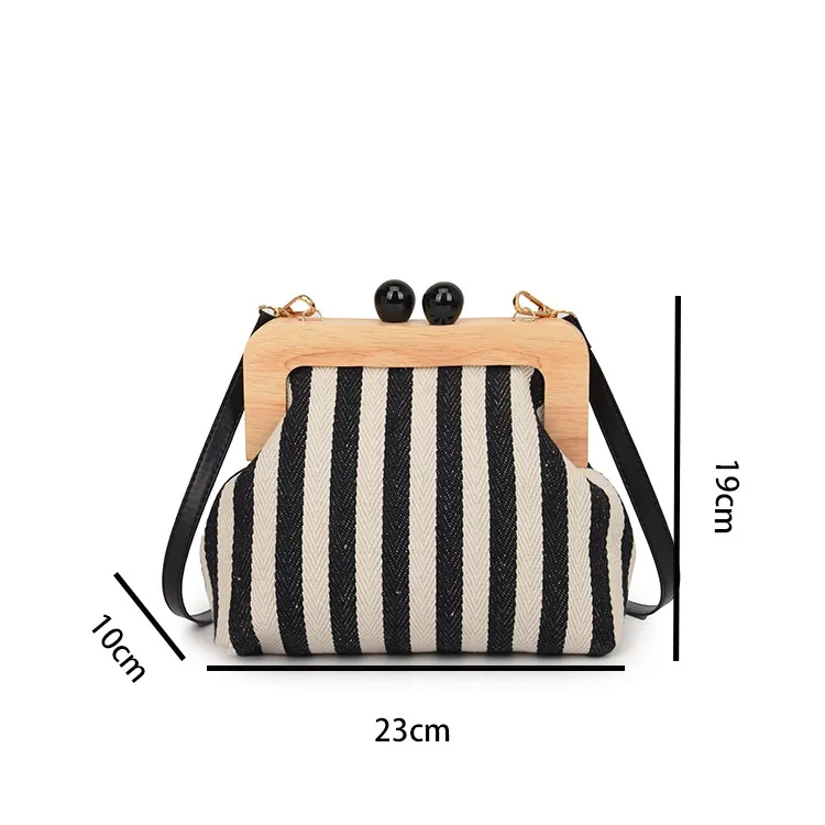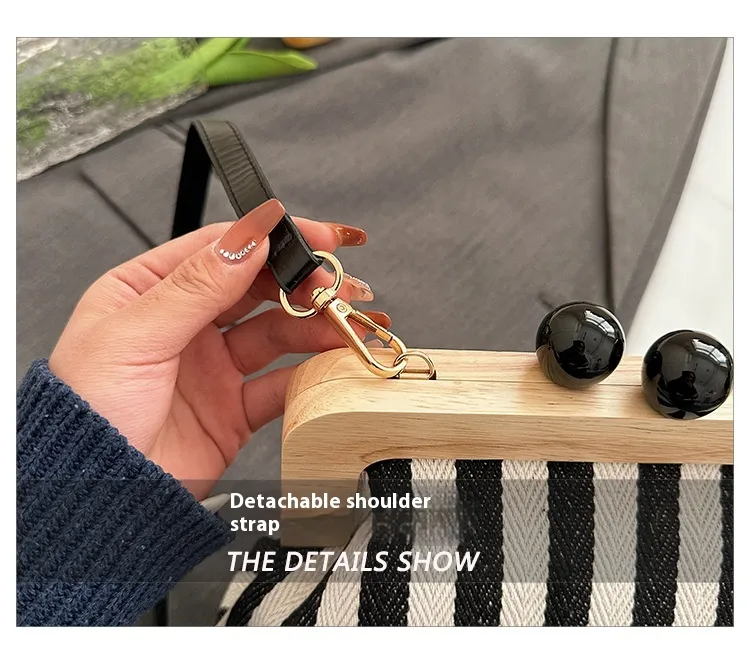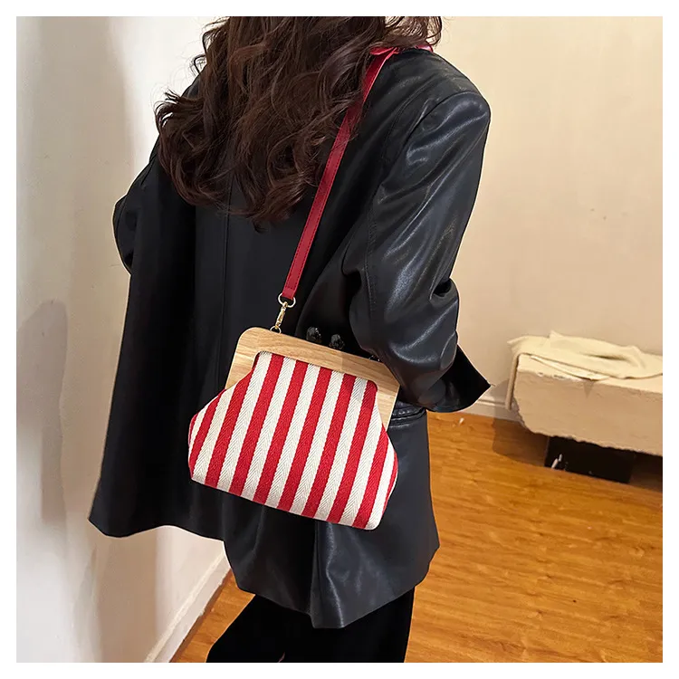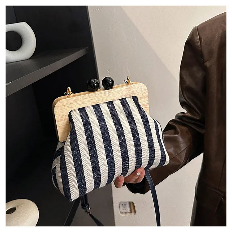 New Striped Canvas Wooden Clip-mouth Clutch
