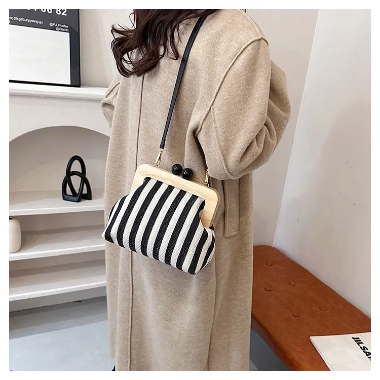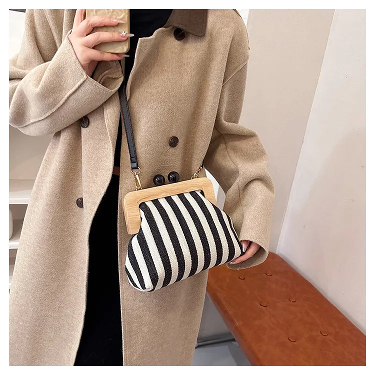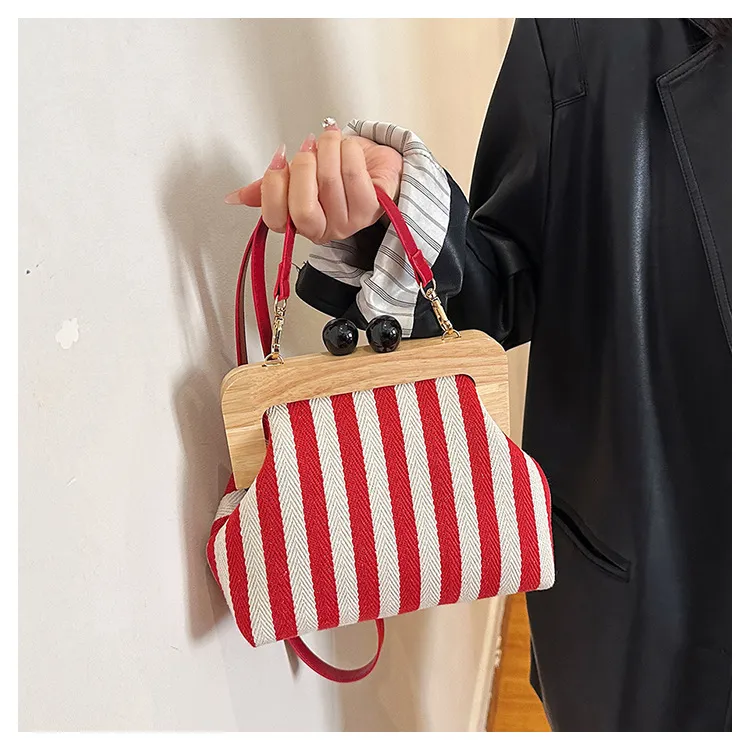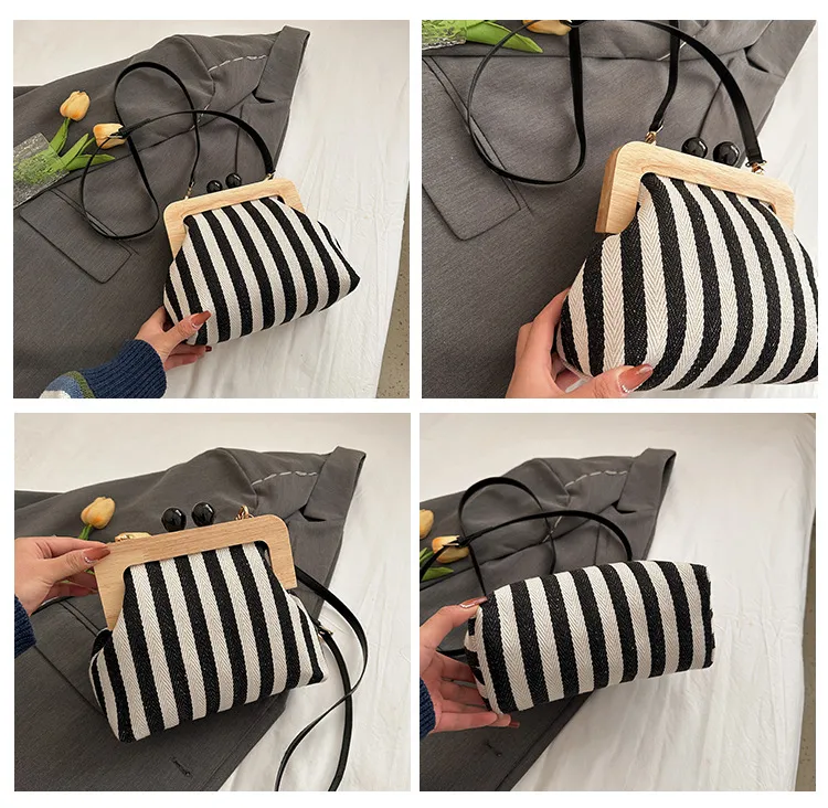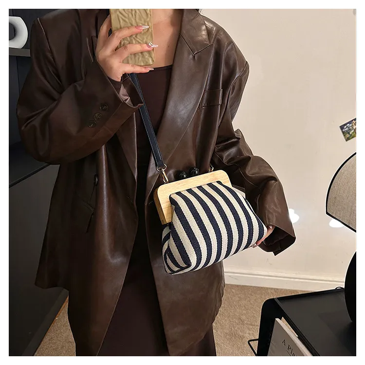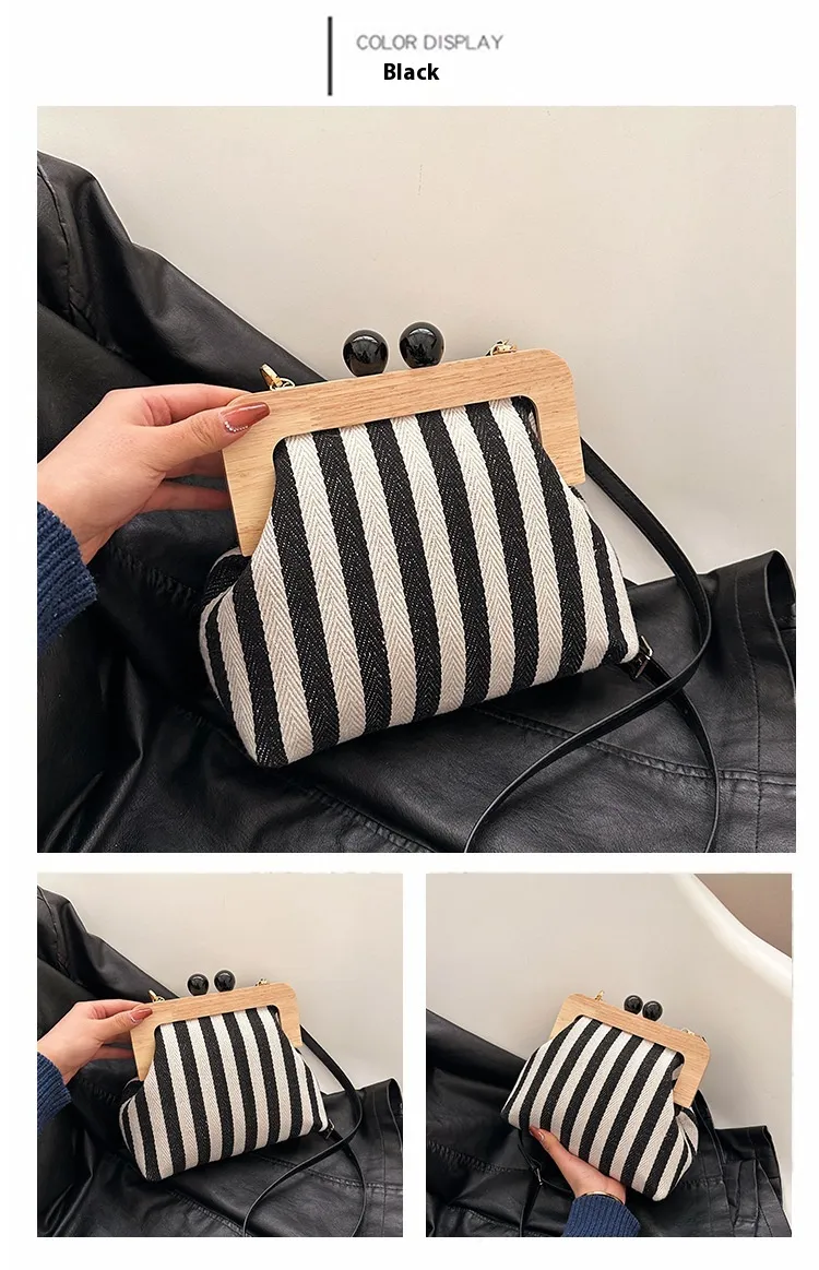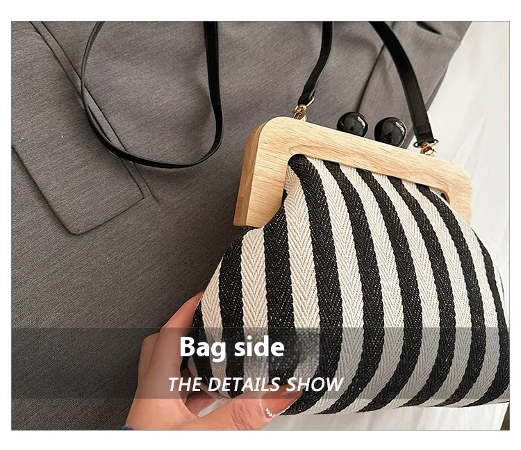 New Striped Canvas Wooden Clip-mouth Clutch