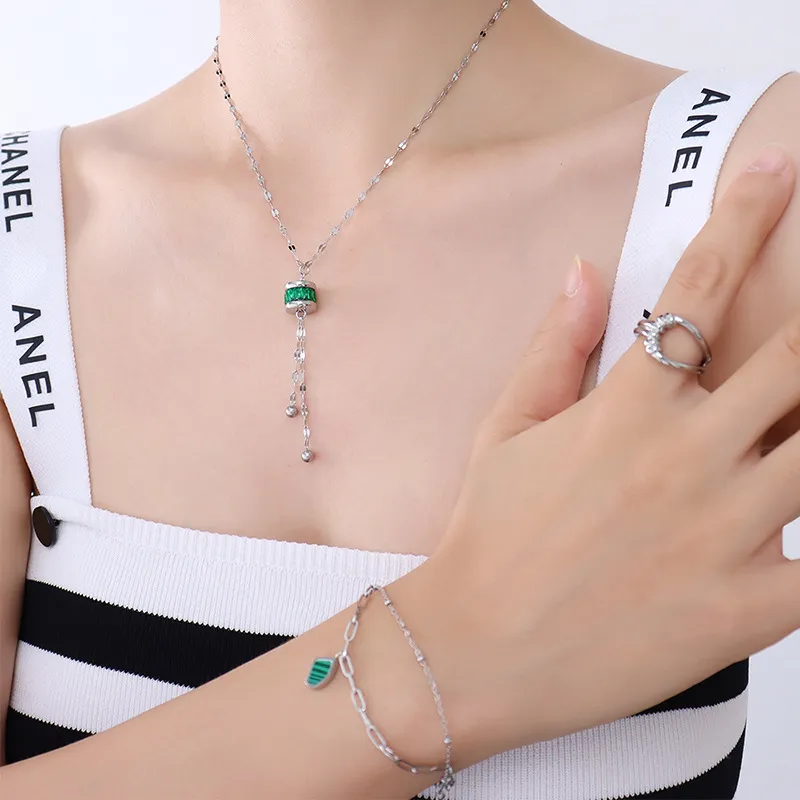 Niche Design Retro Light Luxury Emerald Tassel Pendant Necklace