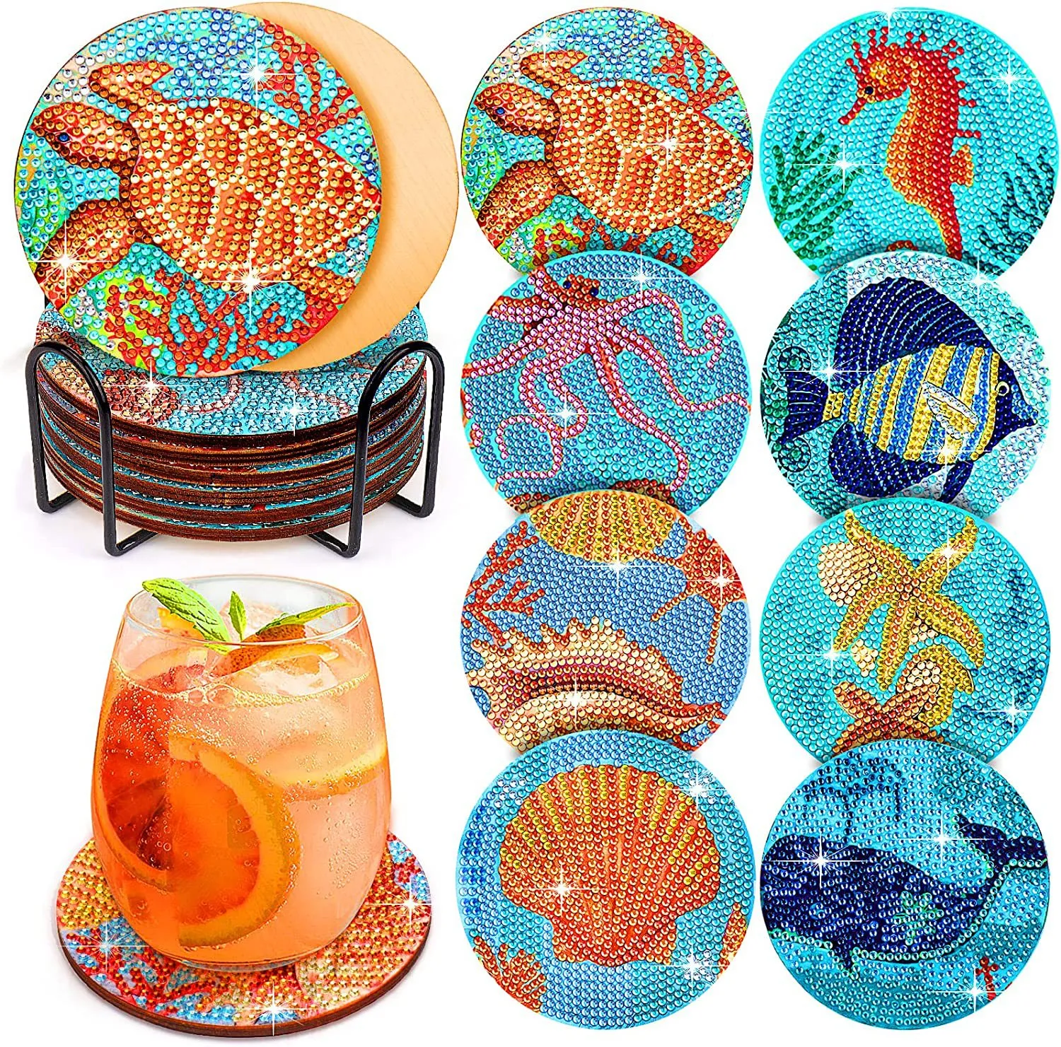 Ocean Series Diamond Painting Coaster Set Rhinestones Wooden Table Placemat With Rack For Home Decor Kitchen Accessories